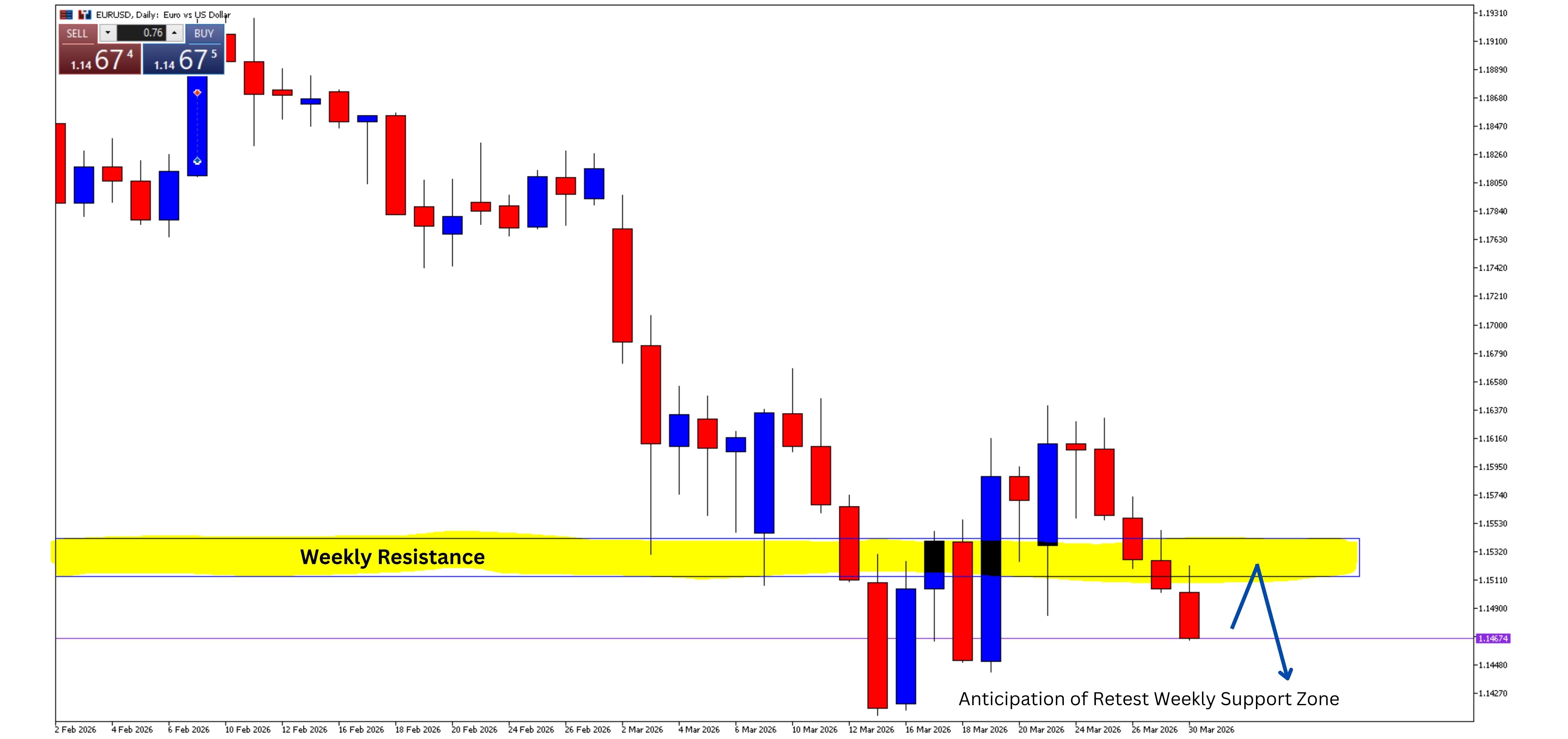 1. Down anticipation: If price retests the weekly resistance zone, we will anticipate a clear bearish rejection on the daily timeframe as confirmation. This will provide a higher-probability entry opportunity in line with the overall bearish trend.