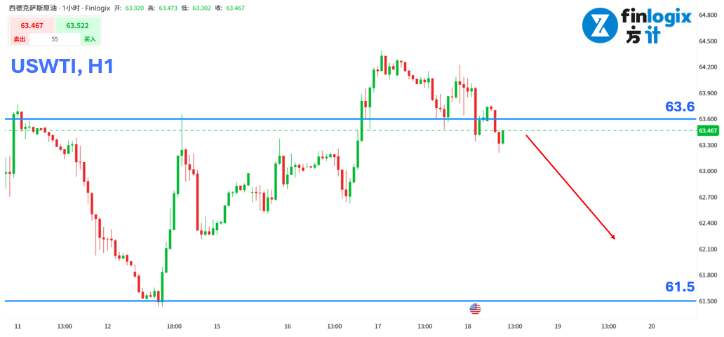 技术面:美国最新原油库存数据远低于预期,却未能推动油价延续涨势。在产油国增产、需求未显着提升,以及夏季旺季结束的背景下,油价续涨动能不足,维持「逢高偏空」观点。技术面也出现头部型态,反弹至63.6~64区间遇阻,考虑偏空。