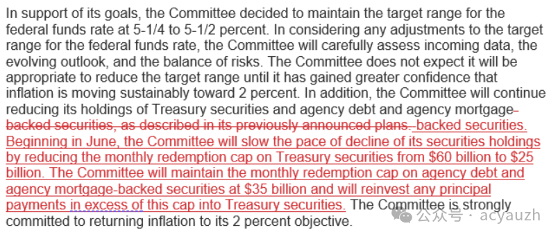 首先是放缓缩表。在本次利率决议中,除了对通胀的描述有所调整外,最大的变化就是新增了一段对缩表规模的调整。从6月份开始,美联储将每月缩表的规模从600亿美元降至250亿美元。虽然市场对此早有预判,但每月下调350亿规模仍大于预期的300亿。决议因此释放鸽派信号。