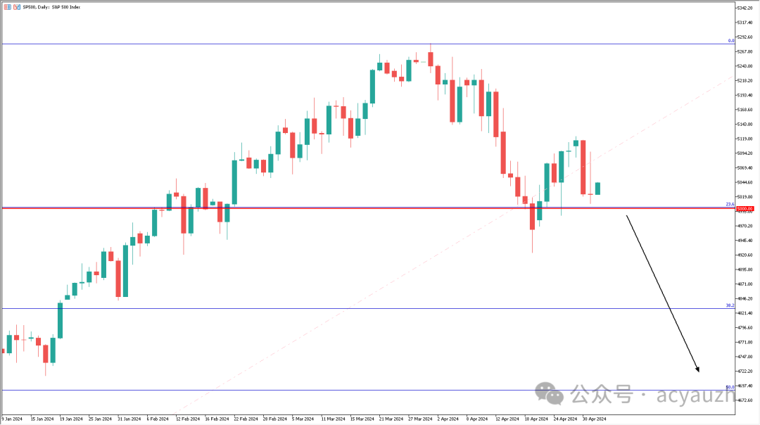 从标普指数日线图来看,指数在触及斐波那契0.236回调线,5000整数位大关时形成假突破,目前正在测试5000大关的头部支撑效果。消息面来看,既然鲍威尔重点提到就业会影响降息,那么明晚的非农数据便格外的重要。如果非农数据和ADP一样高于市场预期,达到30万以上,同时失业率保持在3.8%及以下,那么伴随美元的反弹,美股将承受巨大压力,标普指数将再次跌破5000大关。而这一次跌破就不再是测试,而是形成技术面反转空头格局。中短线交易策略应该以突破跟随为主,下方的目标点在4850和4700两个位置。上方阻力则可以关注5150的前高点位置。
