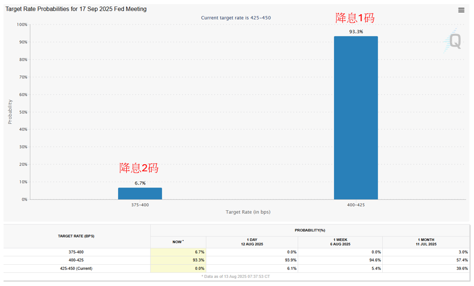 市场焦点已不在于美联储9月是否会降息,而是降息幅度究竟是1码还是2码。尤其昨日美国财政部长贝森特在专访中明确表示,支持9月先降息2码,并暗示未来可能展开一连串降息行动,这一表态显著提升了市场对降息两码的预期。目前利率期货显示,9月FOMC降息1码的机率依然高于90%,而降息2码的机率则从前一日的0%跃升至7%