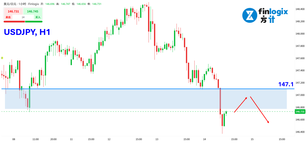 技术面:日元是今天开盘后表现最强势的非美货币,美元兑日元跌破147关口,小时线显示明显看空信号,目前在146.5附近获得支撑。日内可关注反弹止涨后的偏空机会,若美日货币对回升至146.8~147.1遇阻,可考虑做空布局。