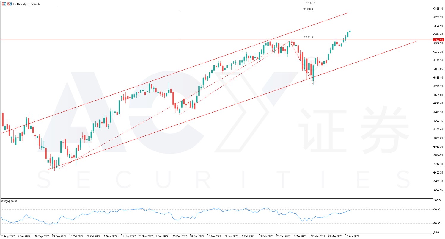 不过投资法国指数需要注意,奢侈品等非必须消费品板块虽然占据了大头,但毕竟指数还包含了其他板块。法国金融板块在银行风波期间的回调幅度并不小。投资者需要注意,一旦衰退来临,法国指数只是相对美国指数更加抗压,适合作为分散投资,而非直接对冲。从法国CAC指数日线图来看,受到奢侈品行业的利好以及加息预期的降温,指数突破了7400的前高点多重水平线。指标方面来看,RSI相对强弱指标接近超卖区,说明指数存在超涨压力,短线顺势看涨的风险较高,交易策略应该采用回踩做多为主,关注7400大关以及下方7150的需求区域支撑。目标位置可以关注斐波那契扩展线7800附近。