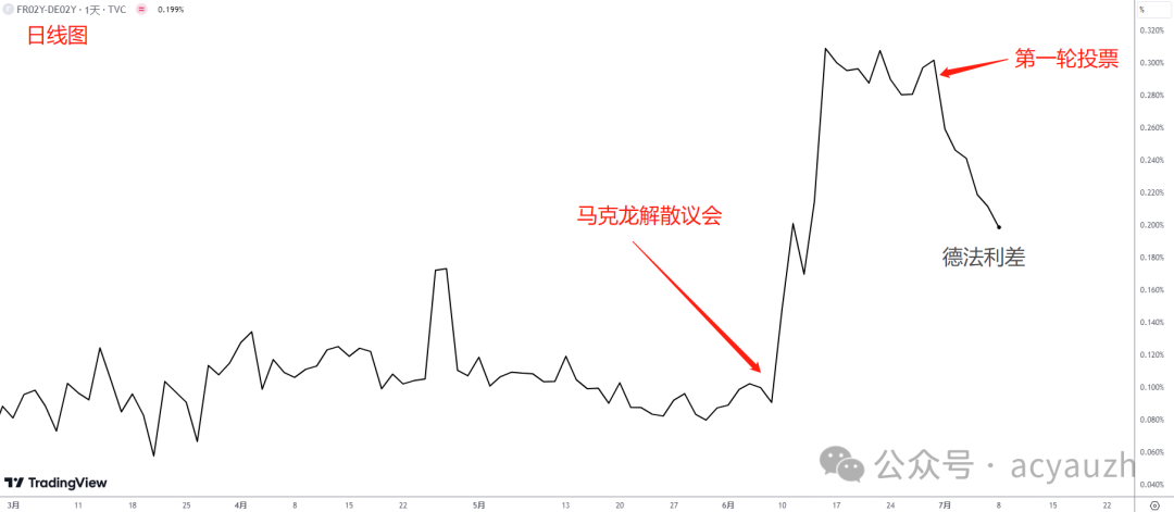 让我们回到金融市场。从行情来看,马克龙解散议会触发了市场的风险警报,导致欧元与欧股同步下跌。
