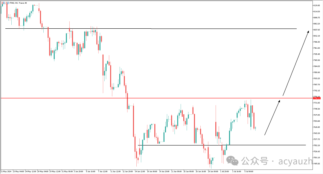 从法国股指四小时图来看,自从马克龙解散议会后,指数便持续下跌,直到第一轮投票后,才有反弹的迹象。而且目前欧股与美股之间出现巨大缺口,这部分缺口终究将被回补,这也让欧股的投资潜力提高。现价在7750关口受阻,该位置是底部颈线关键阻力,一旦突破便有持续看涨的机会。考虑到美国经济数据带来的波动,也可以在低位进行布局。现价下方的支撑在7550附近,阻力看7750,一旦突破上方的目标位置则可以关注8050附近。不过一旦指数跌破7500,就需要警惕是否有基本面的扭转。