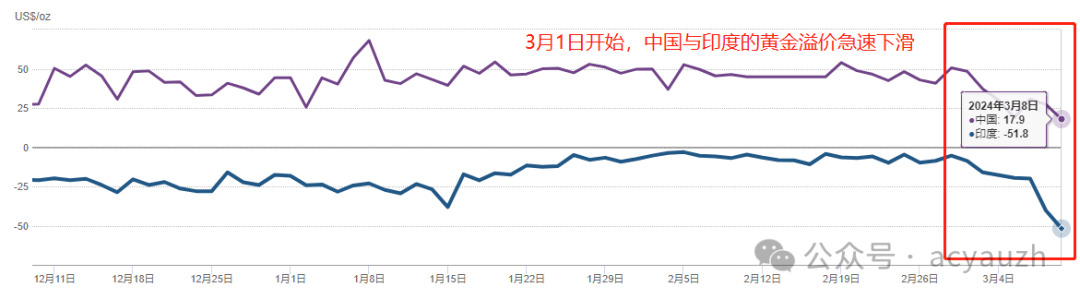 事实截然相反。从3月1日开始,中印与国家金价之间的溢价大幅下降,也就是说,这波金价的上涨非但不是来源于中国和印度,甚至还没影响到中印金价。因此黄金价格的暴涨另有原因。