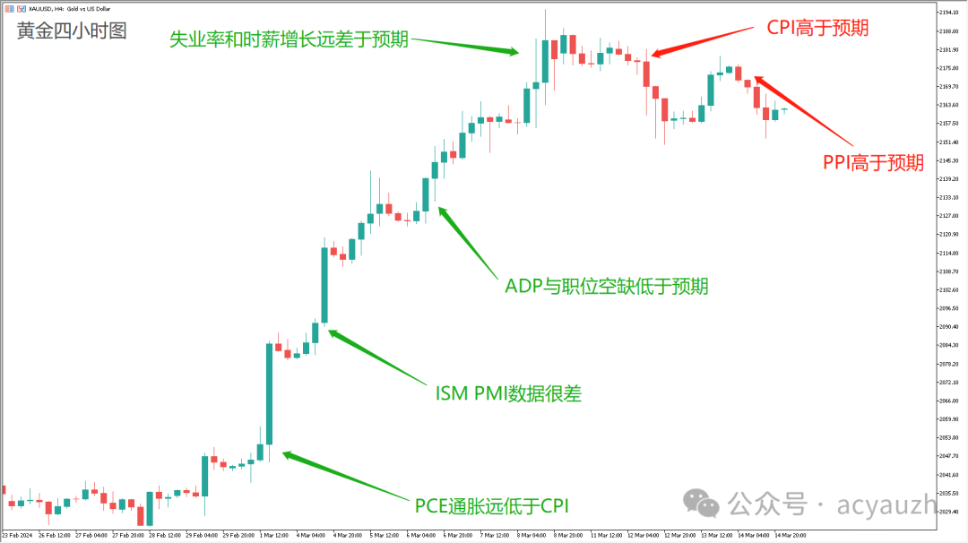 细看最近黄金的上涨能够发现,每一次金价向上的突破都是由差劲的美国经济数据表现引发的。先是PCE通胀符合预期,打破了人们对CPI顽固的预期,随后制造业、服务业以及就业数据不及预期,令金价持续上涨,一直到非农发布。在这个过程中,市场对美联储降息时间的判断在不断提前。不过有意思的是,在失业率和时薪增长远不及预期的前提下,黄金却没能向上突破,反而冲高回落。不过就在本周,美国CPI和PPI数据发布,通胀数据超过市场预期,令金价见顶回落,两次回踩2150关口。