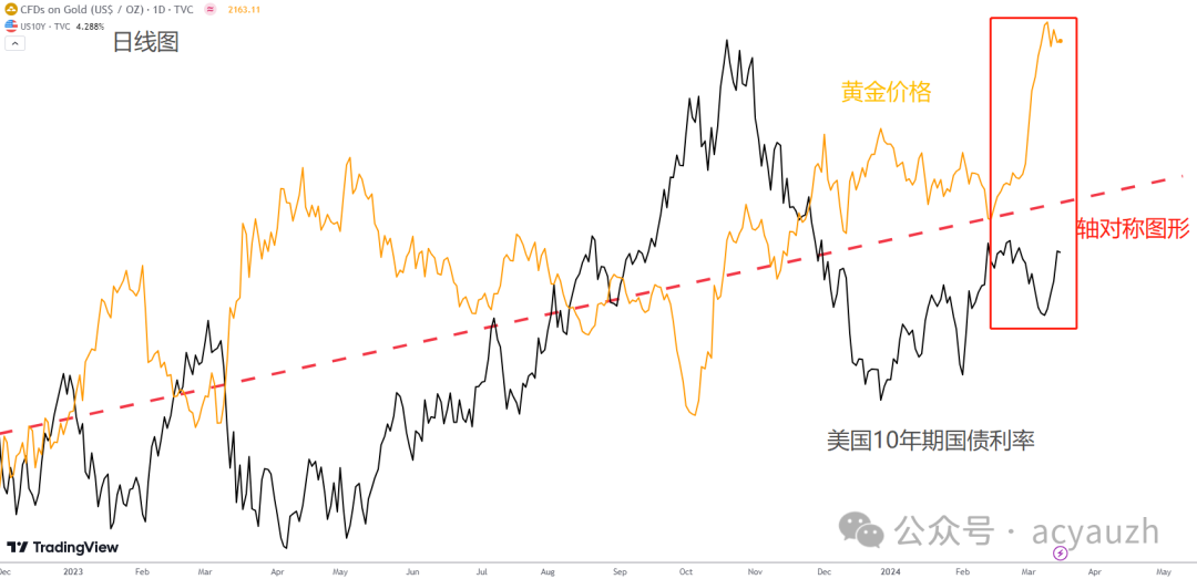 通过对比黄金与美国10年期国债利率,能否发现,两者长期呈现明显的负相关性。两条曲线呈现轴对称图形。不过自从3月份开始,金价突然爆发,涨幅远超过利率的跌幅。而且在金价暴涨的同时,加密coin也同步暴涨,其中不乏资金面驱动。理性来看,目前的金价已经纳入过多的降息预期,或者说已经涨过头了。