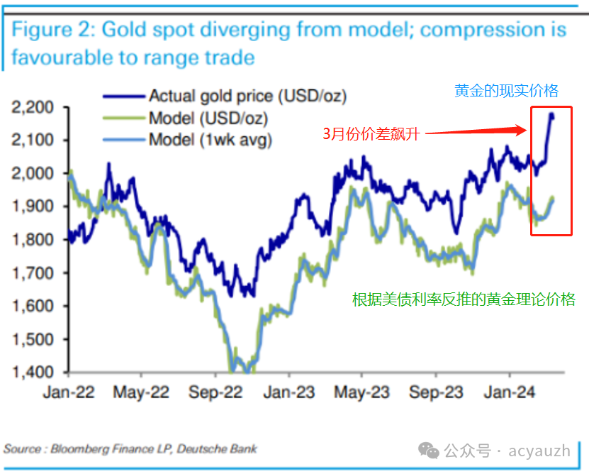 黄金的过度上涨已经被不少华尔街机构意识到了。以德意志银行的最新报告来说,黄金的现实价格与理论价格之间出现巨大背离,价格之差已经达到了最大值的90分位数。在这种差距下,之后只会发生两种行情,要么是金价暴跌,要么就是利率暴跌。