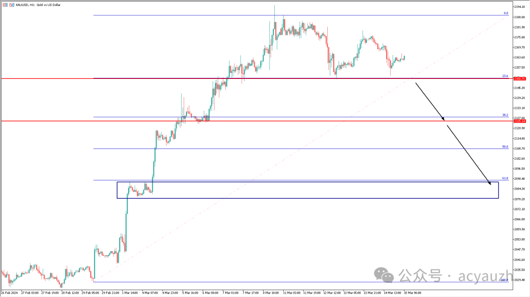 从黄金一小时图来看,即便PPI数据远超预期,动能仍然不足以令金价跌破头部颈线。但这并不是说动能已经耗尽,而是在积蓄着。需要一个信号去触发金价的大跌,而这个信号有时候反而是一些不那么重要的数据。因此做空黄金的话,更需要关注技术面突破的信号。最简单的方法就是关注2150的头部颈线支撑,一旦向下突破,便有回踩做空的机会。高位阻力在2175头部附近。下方目标位置关注斐波那契回调线,也就是2125、2100和2090附近的支撑力量。