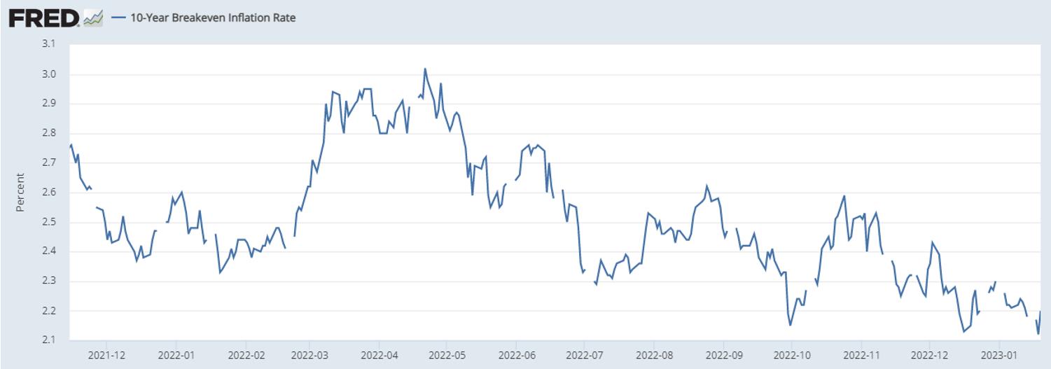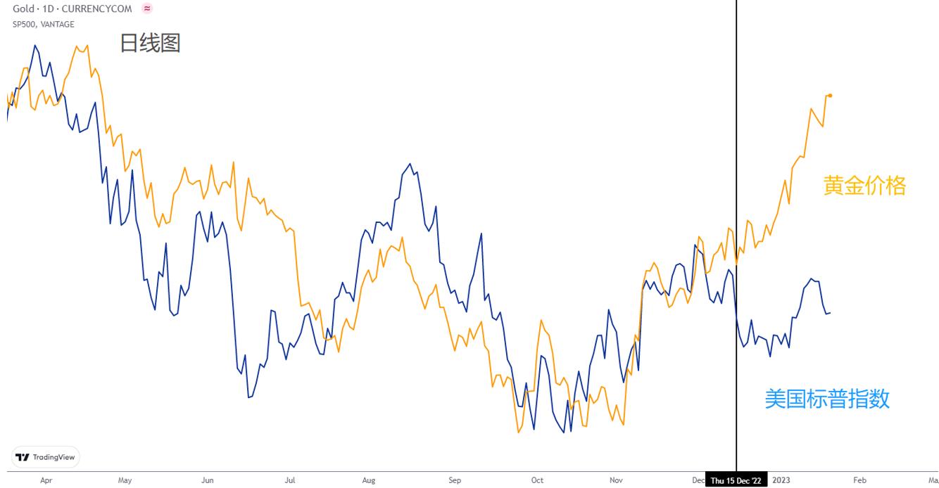 由图可见,自俄乌开战之后,黄金与标普的价格走势趋同,主要是受到美国加息的利空影响。不过自12月中旬开始,金价与标普之间出现了明显的背离。金价之所以上涨,股市之所以走弱,原因就在于越来越多的经济学家开始警告衰退风险。在经济衰退的环境中,企业将大量裁员,削减开支,收缩业务,这对股市表现极为不利。但像黄金、加密货币、美国国债等商品不受衰退影响,反而会在衰退的宽松政策下受到利好。