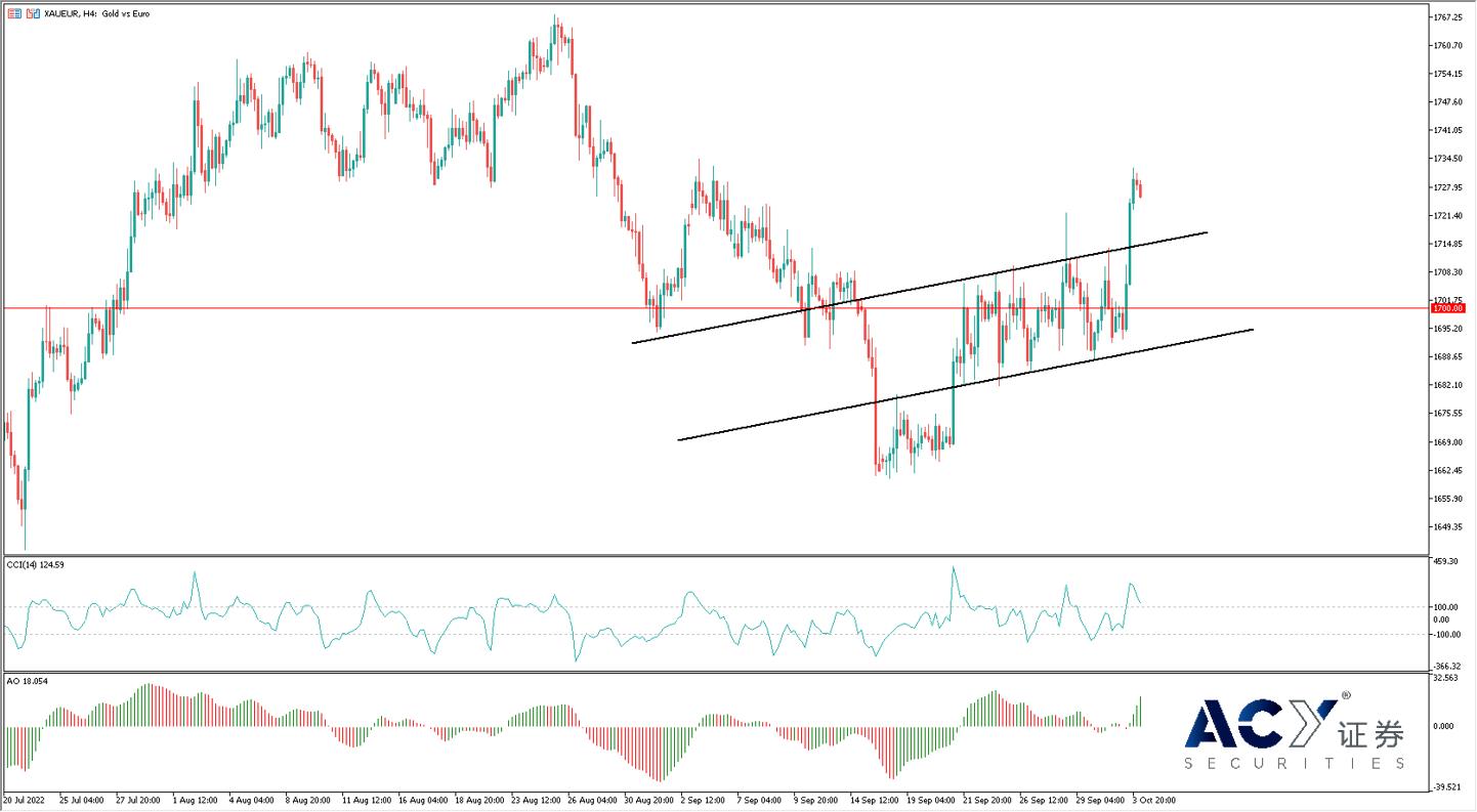 从欧元黄金四小时图来看,金价非但没有跌破前低,反而在震荡后连续上涨。昨日受到美国制造业低迷以及英国减税政策终止等消息面影响,金价突破了前高点1700大关的阻力区间,并击穿了旗形中继结构的上沿阻力,CCI趋势指标也同时突破+100大关。考虑到美元保持强势,俄罗斯战争未平,北溪管道遭到爆破,欧洲的危机正在愈演愈烈,而欧元仍将处在弱势当中。整体来看,交易策略应该以短线回踩做多为主,重点关注上升通道与旗形结构在1700大关提供的支撑效果。可以配合AO柱线上穿零线的的多头信号,提高入场胜率。目标位置可以先看上方1730关口。