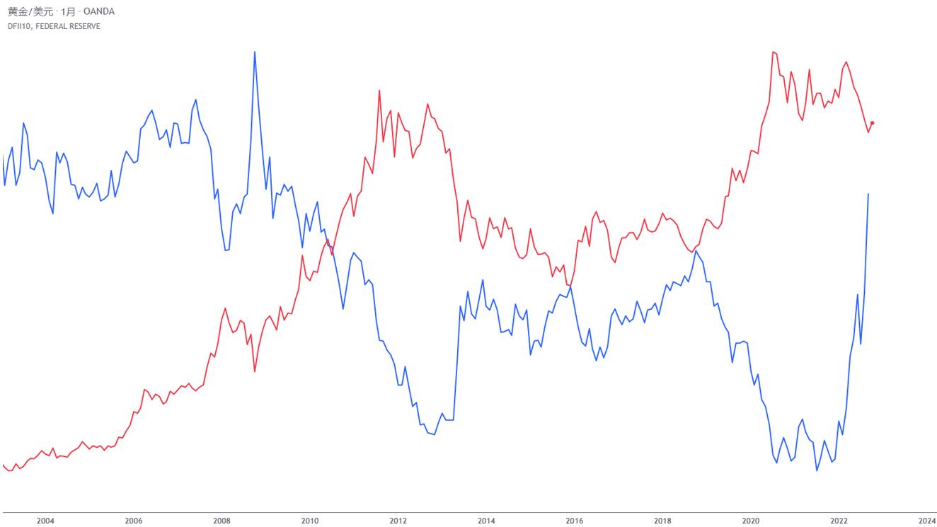由上图实证可见,长期金价(红线)的走势形态恰恰与美国抗通胀债券收益率(蓝线),也就是实际利率,截然相反。在08年金融危机以及20年新冠之后,美国大幅降息以支撑经济,实际利率下降,货币大规模流入市场,导致几乎所有资产(除了08年美国房产)价格飙升,黄金也不例外价格大幅冲高。而在2013年底,为了缓解通胀压力,美国开始了紧缩计划,实际利率反弹,金价也在同一时间大幅回调。然而有意思的是,最近由于美联储强硬的加息态度,导致实际利率在年内飙升,但黄金的价格却一反常态,并未像13年底那样连续探底,反而开始在高位震荡。