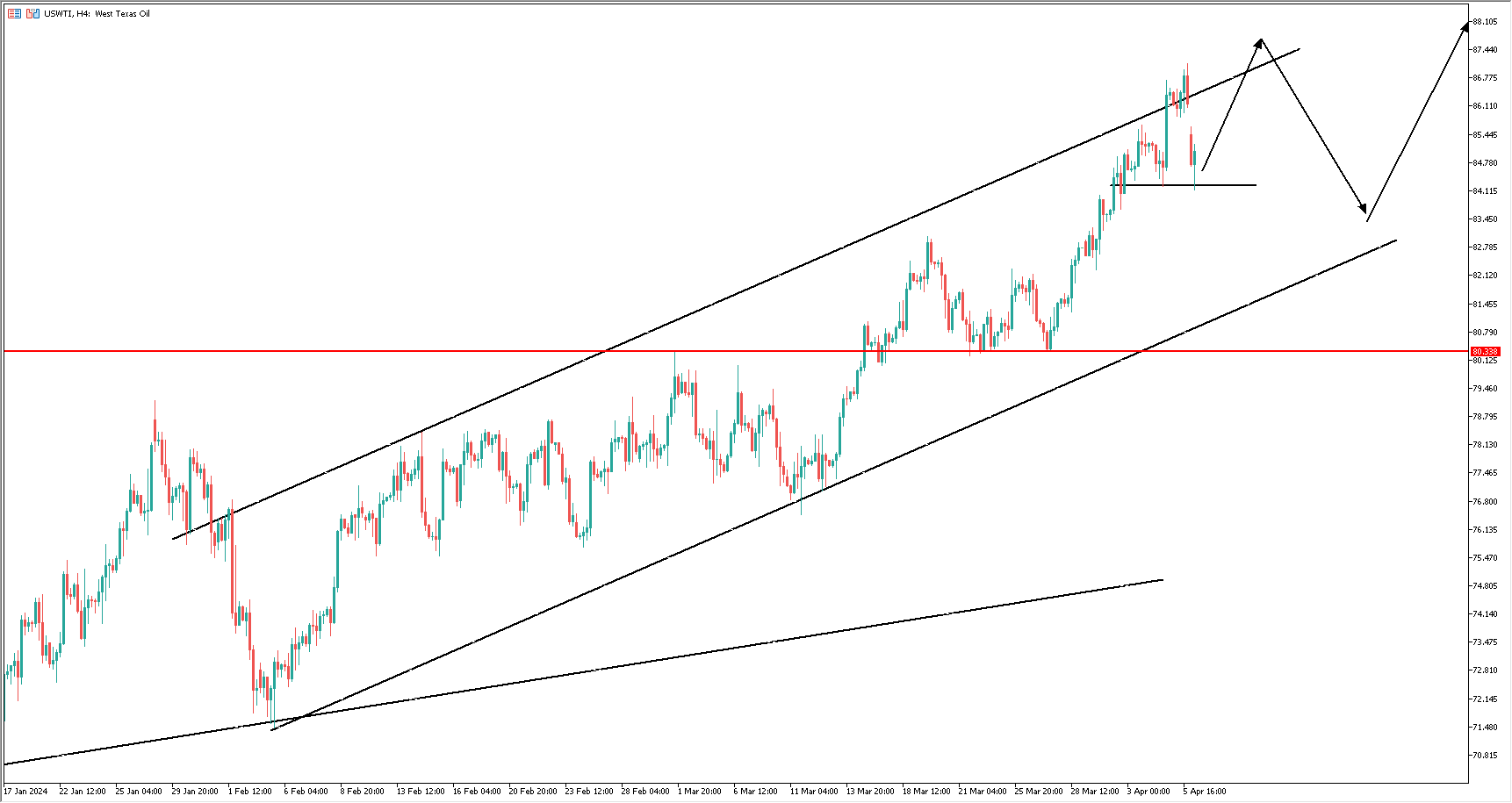 就近来看,本周一,美国政府绕过国会,悄悄地将2000多枚炸弹送到了以色列手中。随后,以色列便发动空袭,导致7名无辜的人道主义工作者失去了生命。面对国际舆论的压力,美国总统拜登不得不在今日凌晨拨通了以色列总理内塔尼亚胡的电话。虽然联合国已经呼吁停火,但拜登在通话中的焦点却还是放在如何减轻以色列军事行动对加沙地带平民和人道主义工作者的伤害,对于促进双方签署停战协议似乎并不怎么上心。哈马斯随后也确认,停火谈判目前毫无进展。更令人担忧的是,面对伊朗的反击威胁,内塔尼亚胡还透露将对伊朗及其代理人发起行动。结果,就在通话后,寻求避险的投资者把手中的资金转向了包括美元、美国债券、黄金在内的多数避险资产中。原油价格也在同时暴涨。