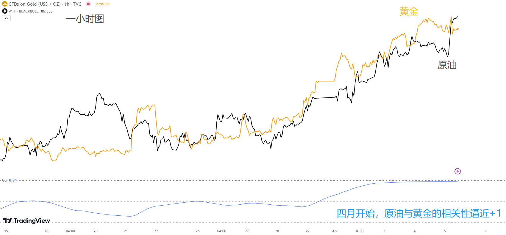 能够发现,黄金这波涨势与原油紧密相关。从四月份来看,金油价格波动的相关性系数持续上涨,并在本周抵达+1的水平。也就是油价和金价同涨同跌。这种行情是典型的战争避险情绪。