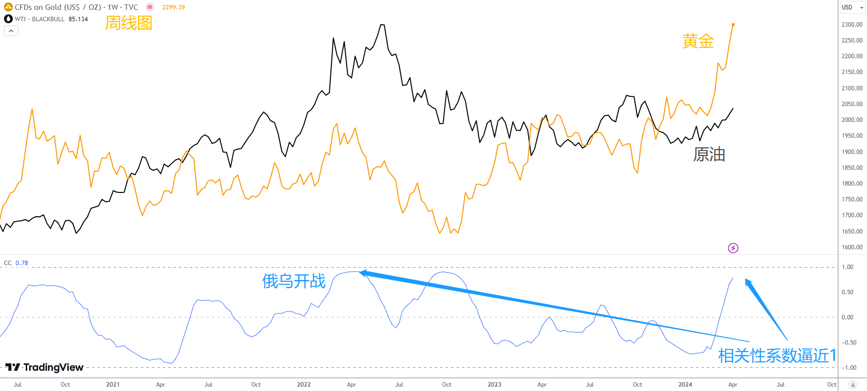 从更长的时间周期来看,上一次金油相关系数逼近+1,还是在俄乌战争开打前后。当时金价大涨15%,油价飙升50%,当下的行情与当时非常相似。