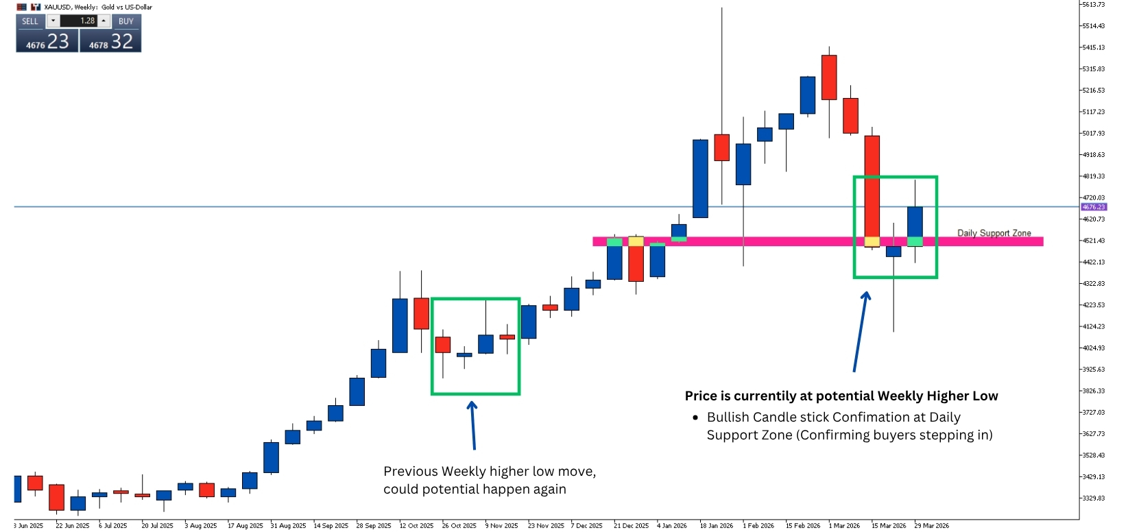 Gold often respects well-defined higher low structures, making it essential to analyze the market from a broader perspective. On the weekly timeframe, focus on the following: