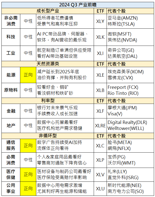 股价通常领先基本面一到两季提前反应,因此展望美股各产业板块在2024年第三季的基本面表现,可以协助投资人在6月布局相关个股或ETF。