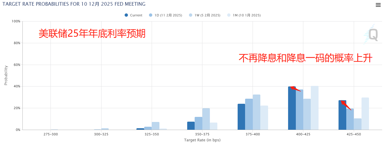 就在通胀数据发布不久,鲍威尔在国会听证会上发表讲话。这一次,他终于明确提及特朗普关税,与以往“继续观察”的态度不同,这次他表示美联储可能因关税调整利率。虽然措辞依旧谨慎,但意思已经很明确——特朗普的关税政策可能迫使美联储延迟降息。受通胀数据和鲍威尔讲话的共同影响,市场对美联储年底前降息的预期已降至0-1码。