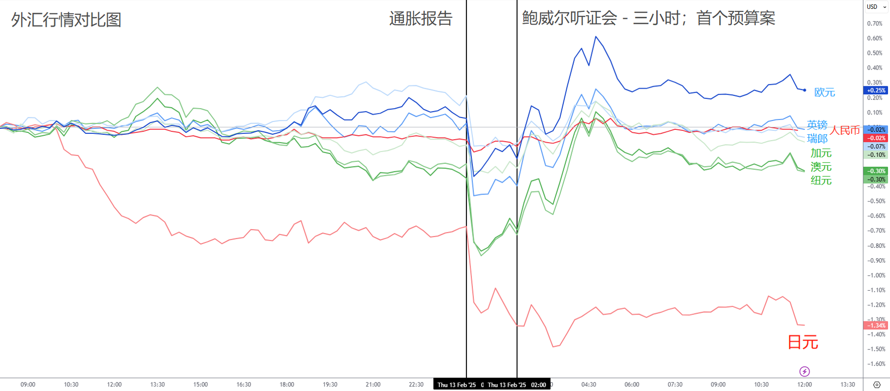 美元:在亚盘与欧盘期间,美元波动不大。然而,通胀数据公布后,美元迅速走高,非美货币集体承压。但行情的真正转折点出现在鲍威尔讲话之后,而关键因素正是关税。由于通胀上升推迟了美联储的降息预期,这反过来却让特朗普的关税政策面临掣肘,市场重新评估经济前景。再加上特朗普并没有宣布对等关税,市场判断特朗普可能“退缩”了。因此,美元走势与美债收益率出现背离,持续走弱,最终回吐了因通胀引发的全部涨幅,收盘几乎持平。与此同时,非美货币普遍反弹,市场表现趋于一致。