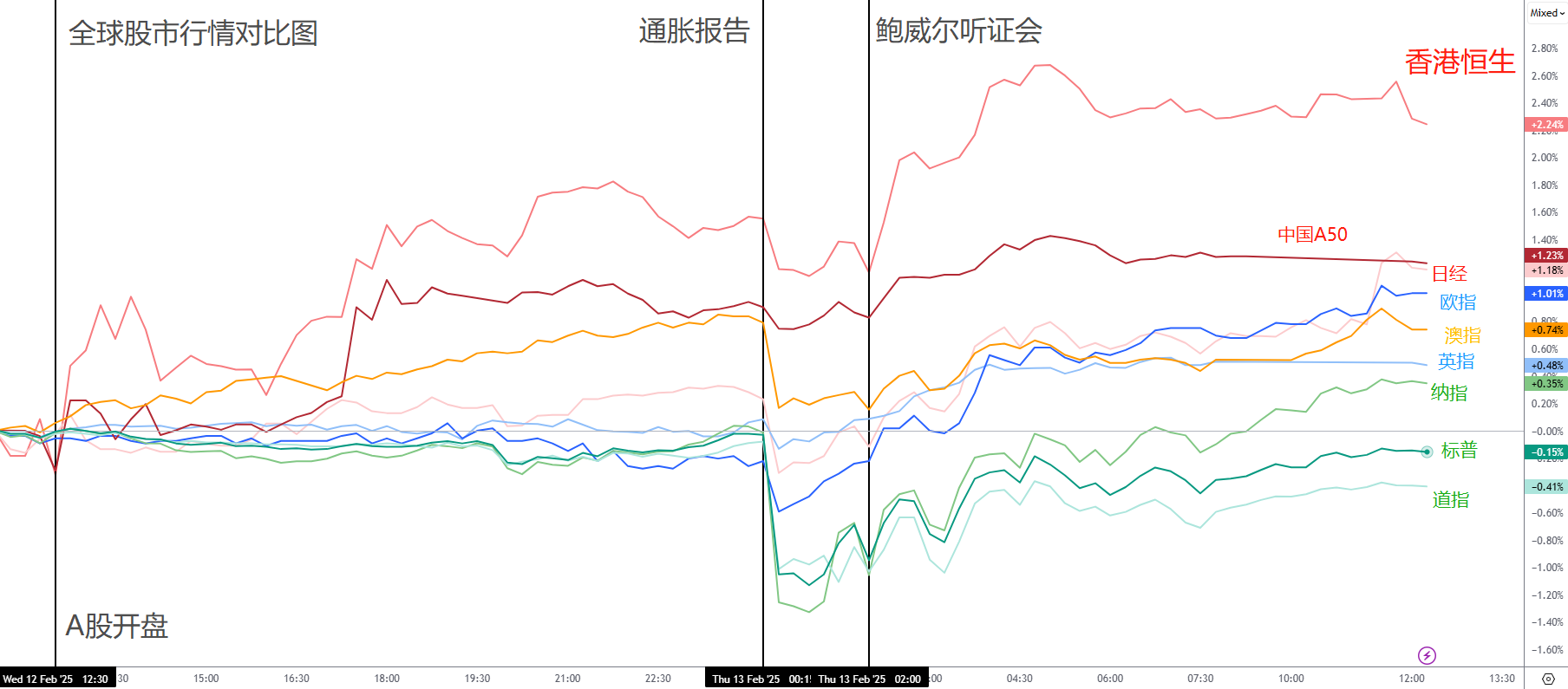 中国AH股市:A股开盘后,两大股指一同上涨,并未太多受到通胀报告的负面影响,反而受到关税推迟预期的正面影响。恒生指数全天表现最佳。澳洲股市也在早盘期间受到利好,但美盘开始便跟随美股波动。