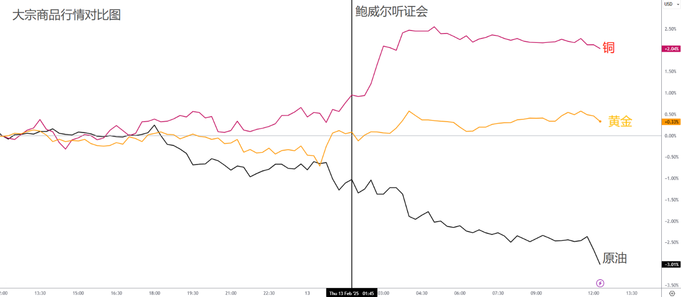黄金与铜:在通胀发布后,金属商品短暂下跌,但很快便回补跌幅。在鲍威尔讲话期间,关税放缓的预期引发金属商品同步上涨。