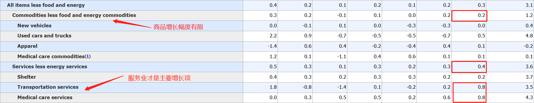 同样的情况也发生在CPI报告中,核心CPI年率为3.1%高于预期和前值,但主要增长项目并非关税相关的商品通胀,而是交通与医药服务价格。
