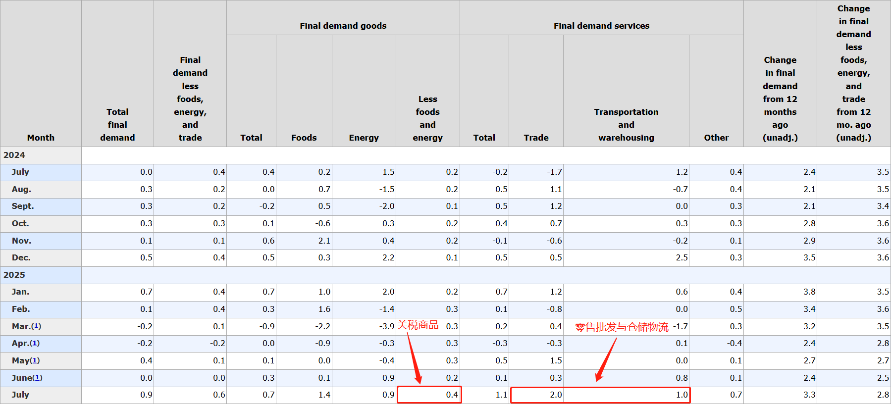 主要的原因还是关税相关的通胀项目上涨幅度有限。就拿昨晚的PPI报告来说,受到关税影响的核心商品月率只有0.4%,而真正造成PPI大涨的是服务业中的零售批发与仓储物流等中间环节。虽然也有分析认为服务价格的上升是因为企业在调整定价以应对关税成本,但这种观点可能并没被市场广泛采纳。