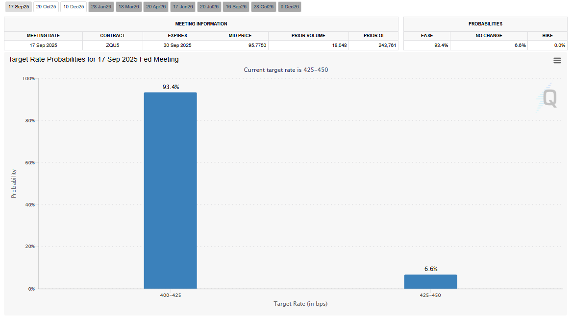The CME FedWatch tool, which tracks market-based probabilities for Fed moves, showed a sharp jump in the likelihood of a 25-basis-point cut at the September meeting, with odds climbing above 90% in the hours after the release.