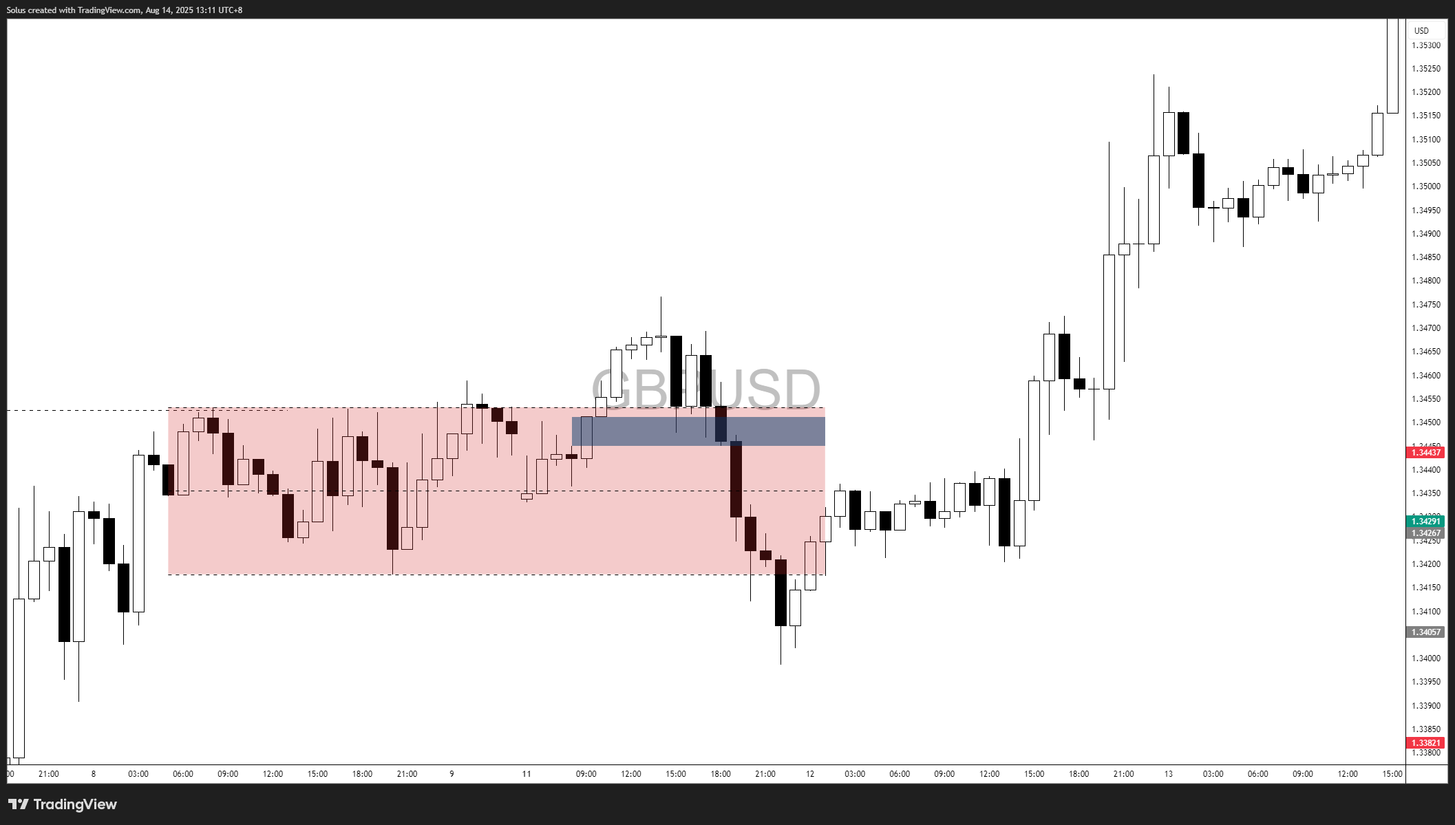Instead of collapsing, GBP/USD pivoted sharply after the July U.S. CPI release, which acted as the fundamental catalyst for the reversal. The sweep-and-reverse pattern triggered a burst of buying, sending price into sustained upside momentum and through key resistance levels.