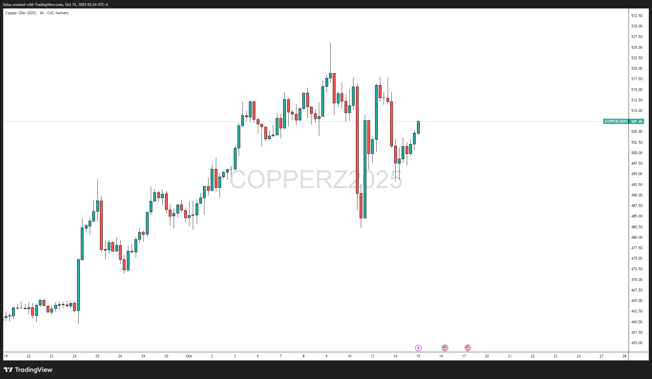 Copper’s current 4H structure is stabilizing after last week’s volatility, now recovering from $480 lows back into the $505–$510 range.