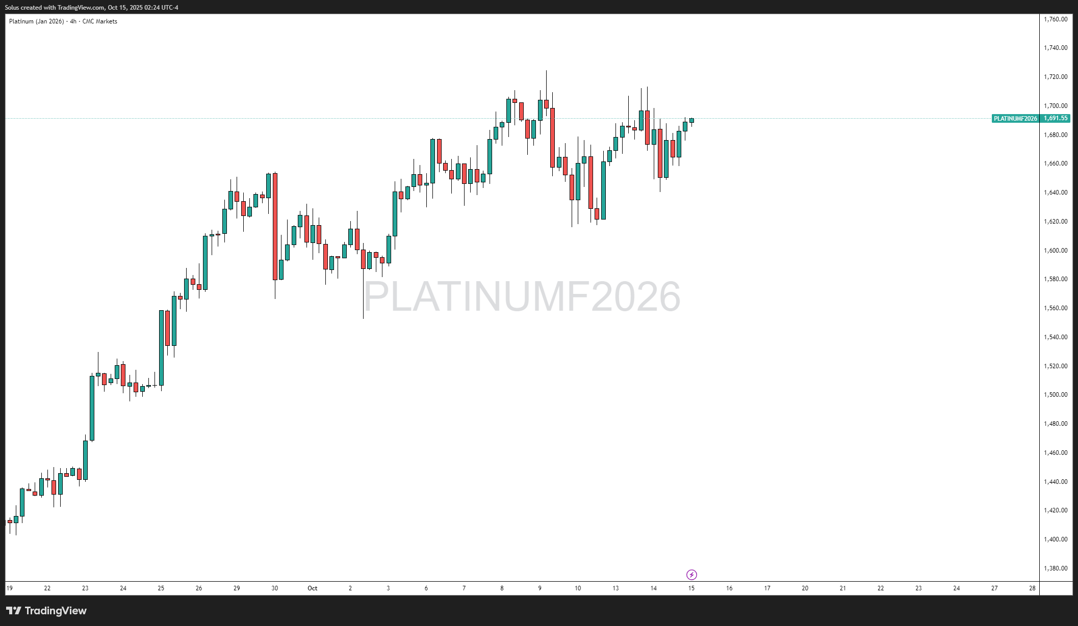 Platinum’s 4H structure shows accumulation inside a tight range ($1,650–$1,700), coiling below resistance with rising higher lows.