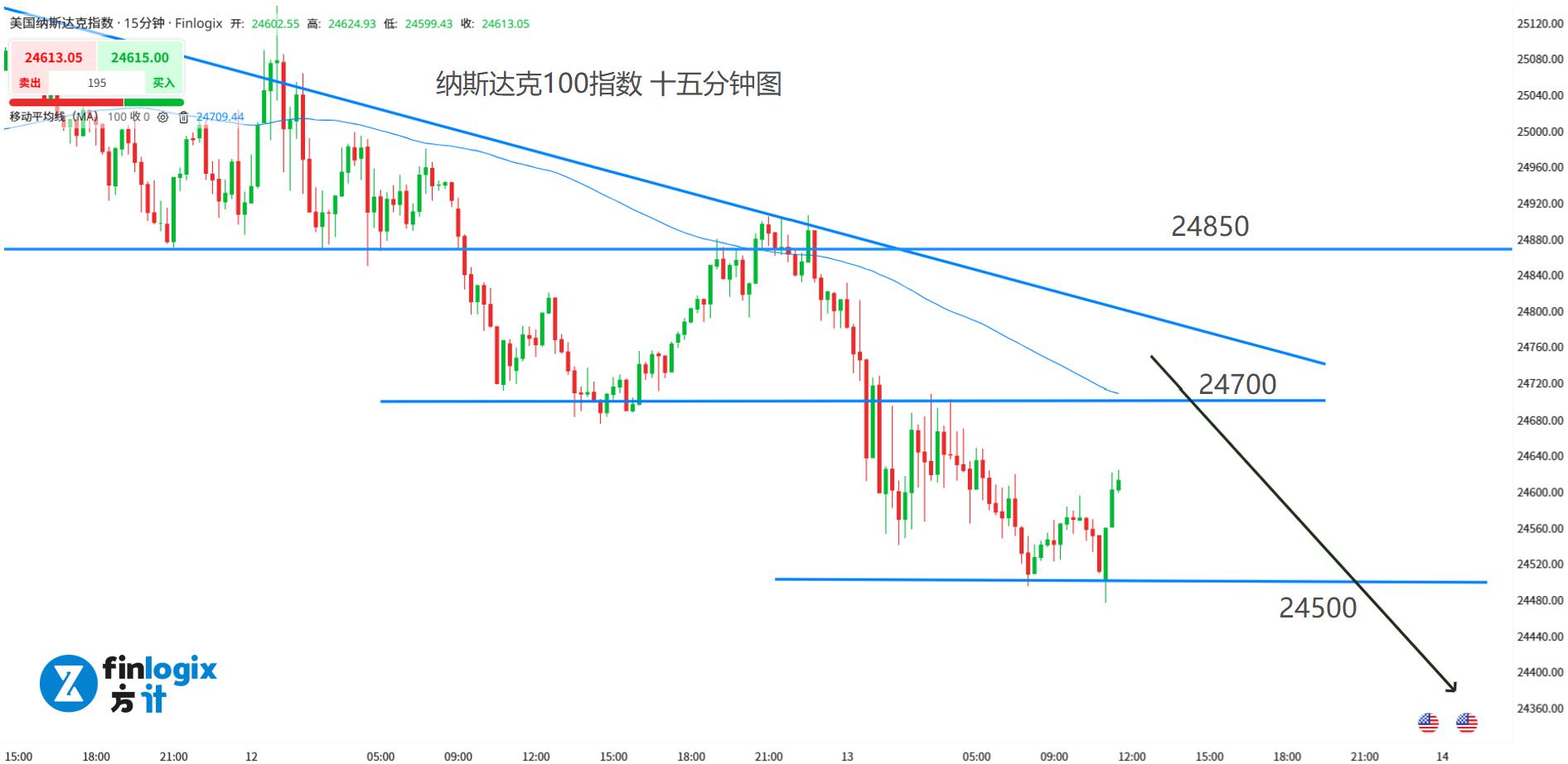 技术面:100均线向下,趋势线提供阻力,空头动能较强。指数跌破24700前低点支撑,以回踩偏空为主。