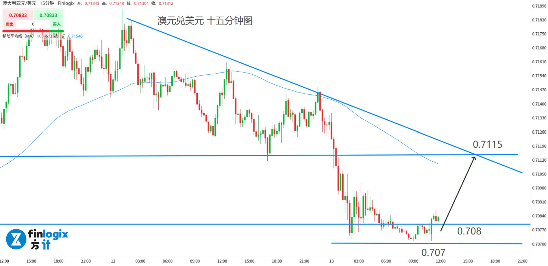 技术面:100均线向下,趋势线提供阻力,多单入场需要设好止损。0.708关口是关键支阻互转水平线,可以考虑在该位置尝试接多,一旦跌破0.707就需要止损离场。