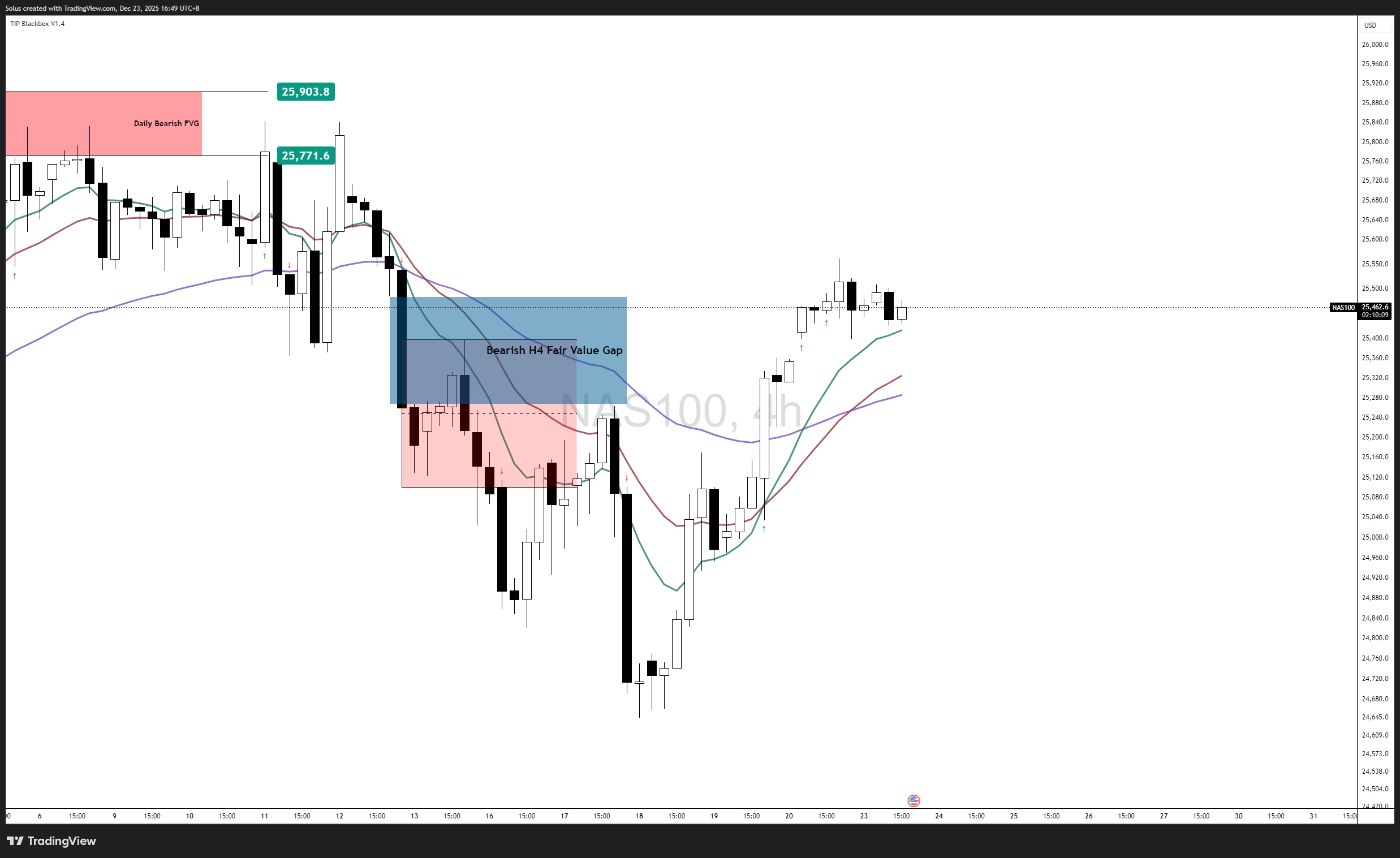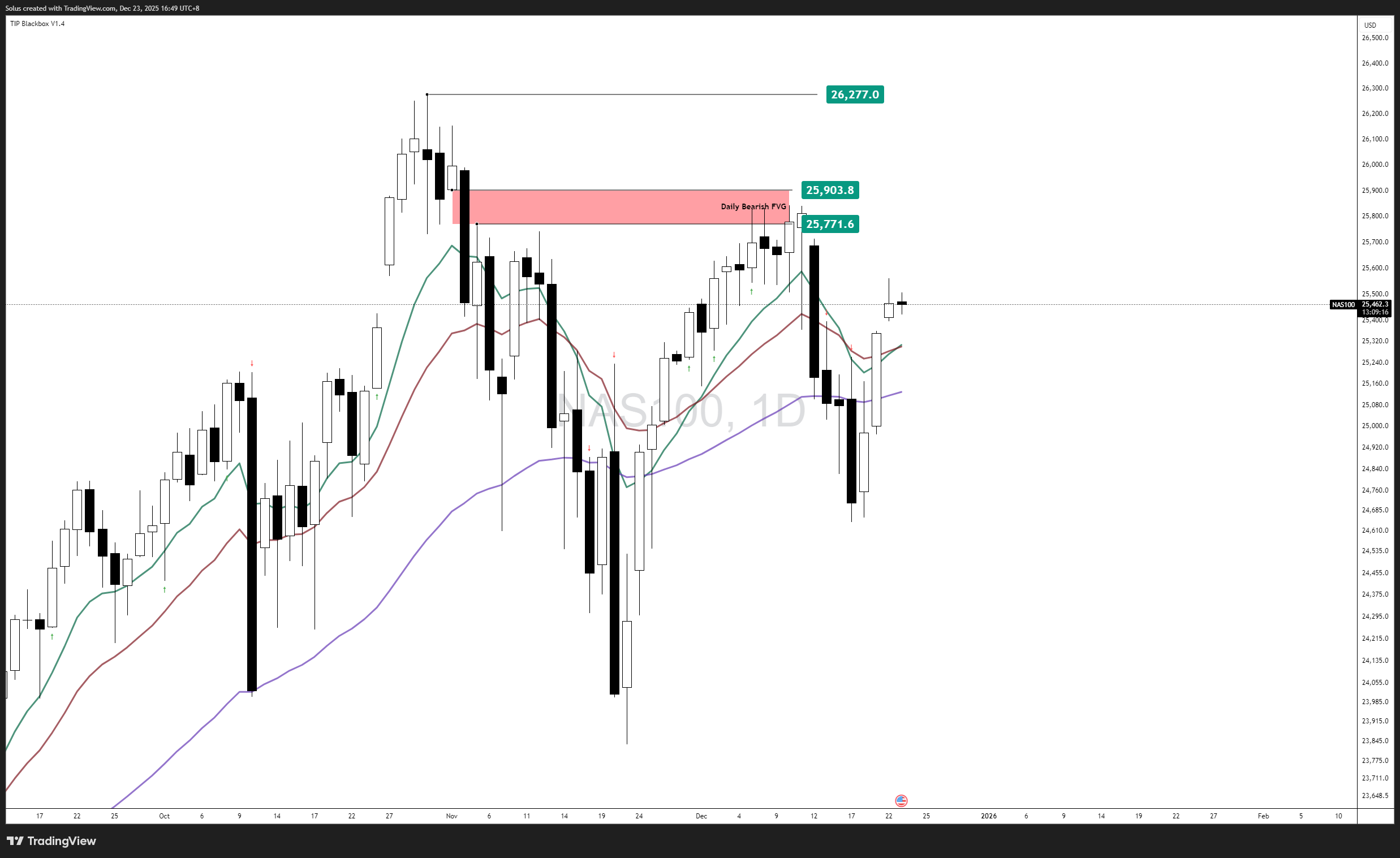 NASDAQ has staged a sharp recovery from December lows, reclaiming key short-term moving averages and restoring upside structure. However, this recovery has lost momentum precisely where it matters most—beneath a Daily bearish Fair Value Gap between 25,770 and 25,900.