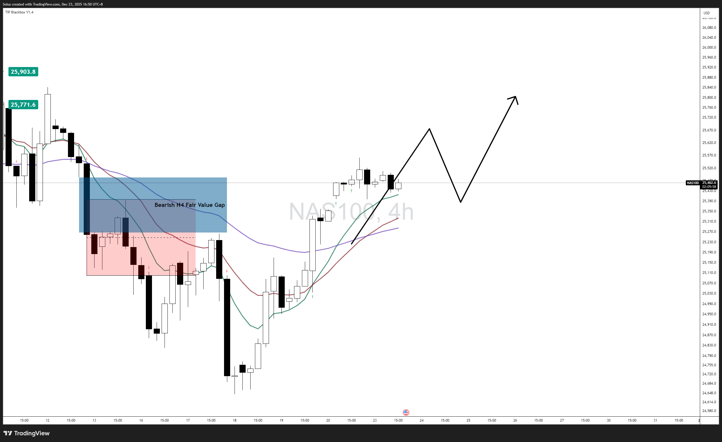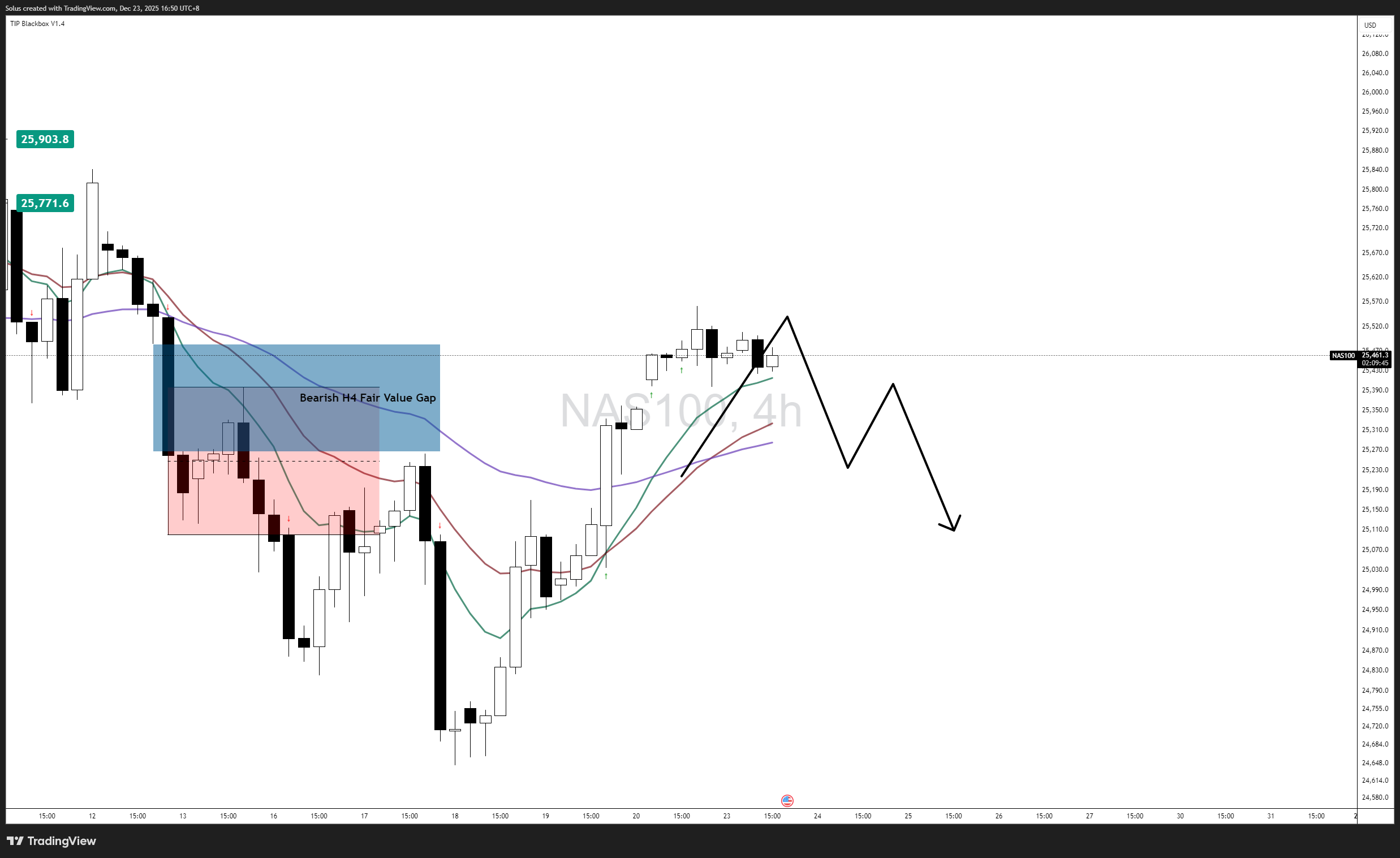 Technical Forecast: Unless price reclaims and holds above 25,900, NASDAQ favors a range-to-corrective structure, with downside risk toward 25,100-24,800 before any sustained breakout attempt.
