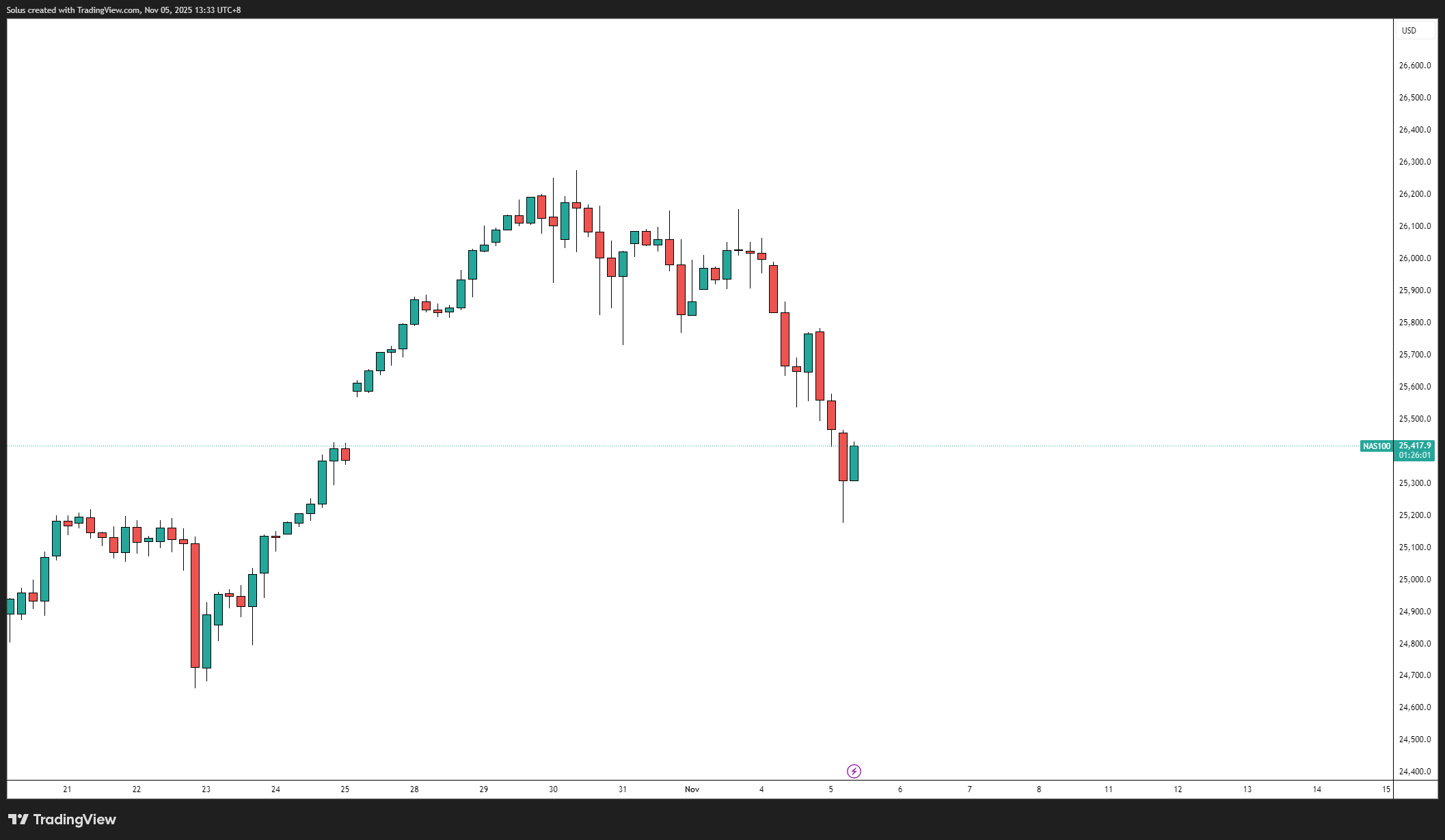 After weeks of AI-driven euphoria, the Nasdaq-100 is undergoing a healthy correction phase. The move comes as traders lock in profits following a strong October rally led by Apple, Microsoft, and Amazon, all of which delivered resilient earnings anchored in AI and cloud revenues.