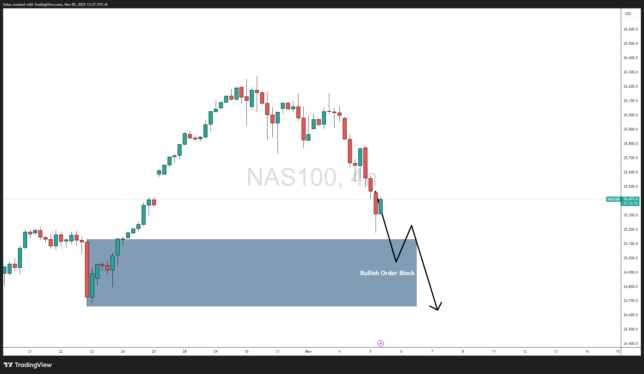 Price is currently holding near 25,400, reacting off a short-term support zone formed by the October 22 breakout base.