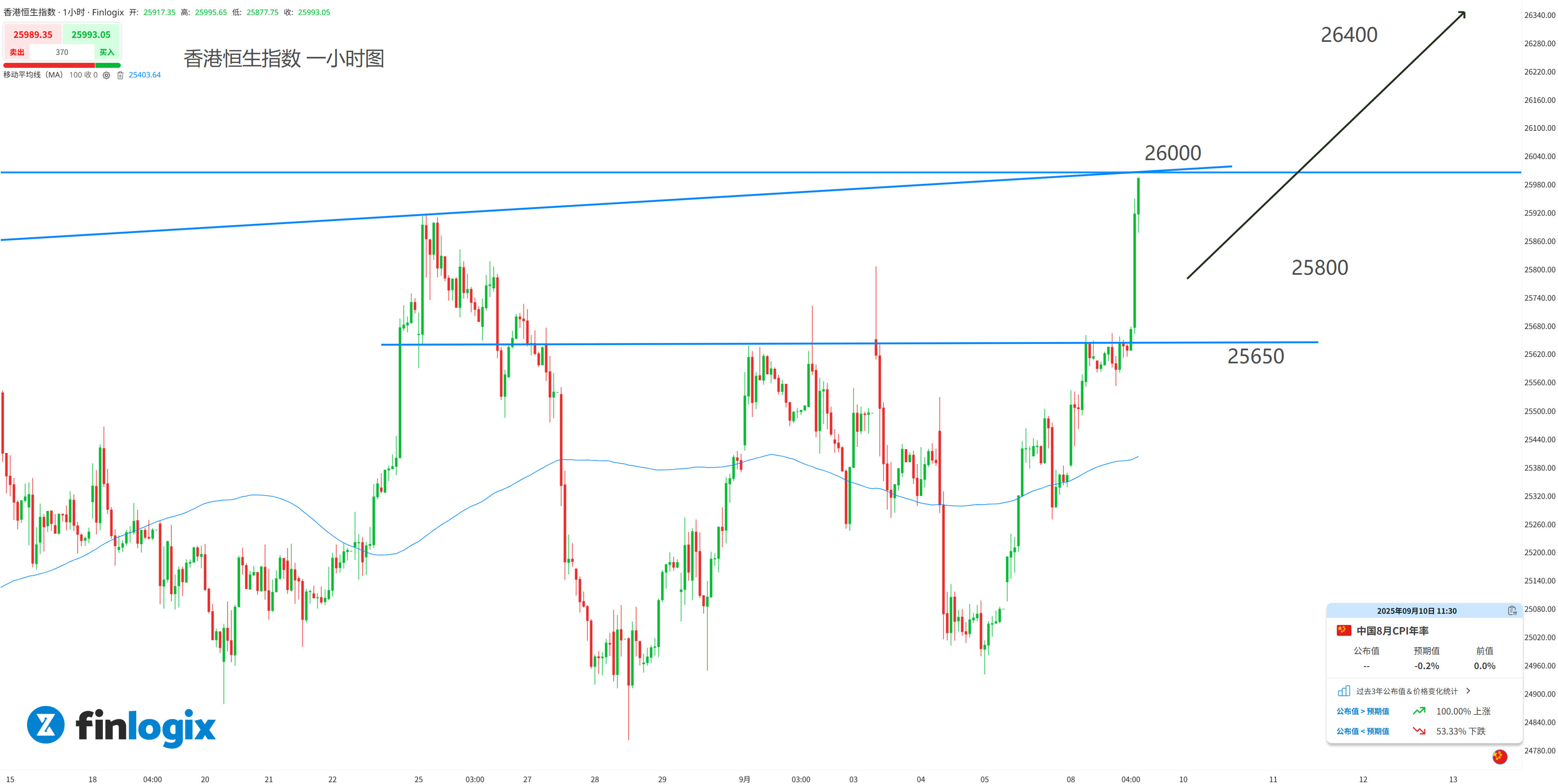 近期美股的上涨动能显著放缓,竞争加剧、估值过高等因素让空头交易者蠢蠢欲动。相比之下,美元的贬值带动港币贬值,香港股市反而更容易受到降息预期的利好。尤其是阿里巴巴与百度等低成本AI模型在GPT-5撞墙后,反而显示出加速落地的竞争优势。因此对香港恒生指数保持趋势性看涨。不过港股想要向上突破需要消息面动能,可以配合今日的融创数据或者更重要的明日的通胀数据。