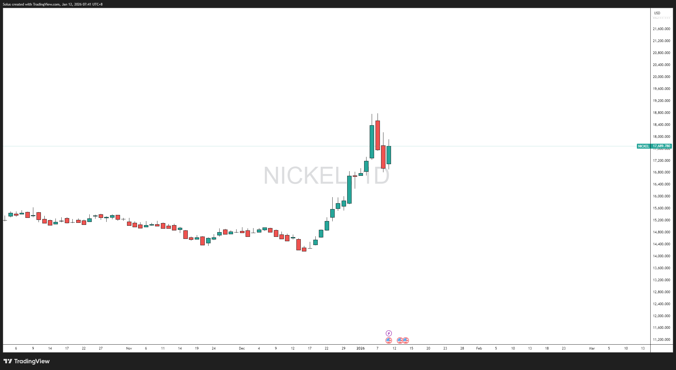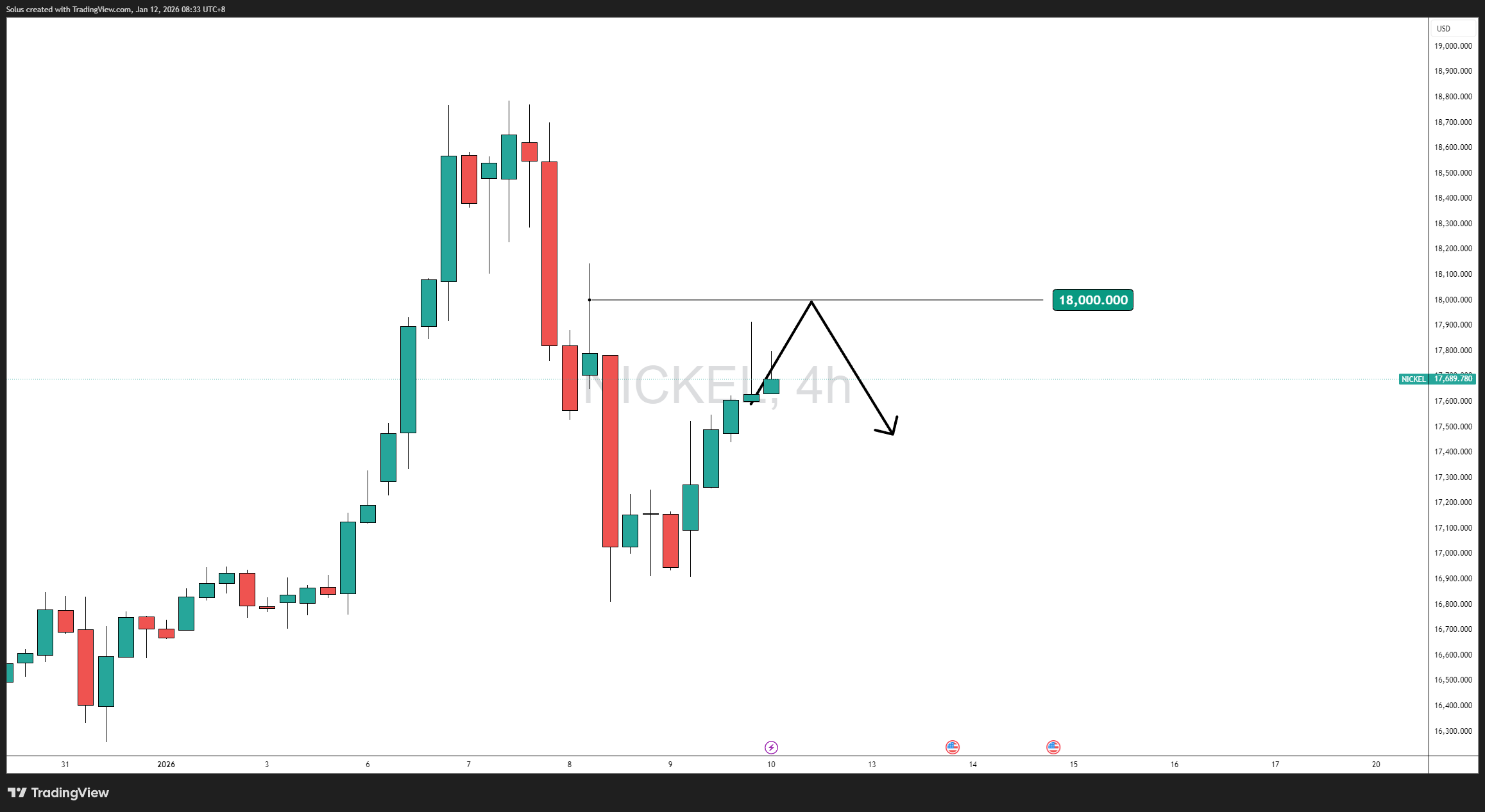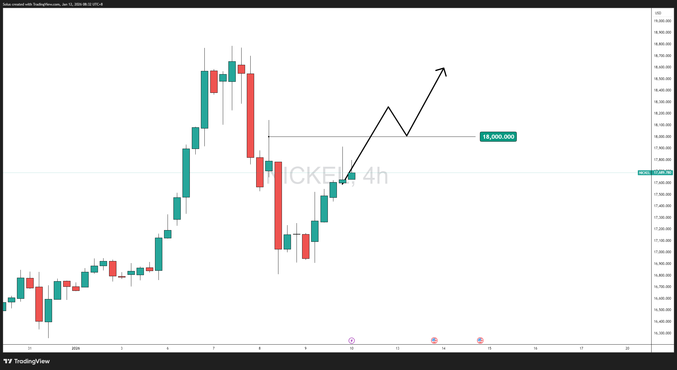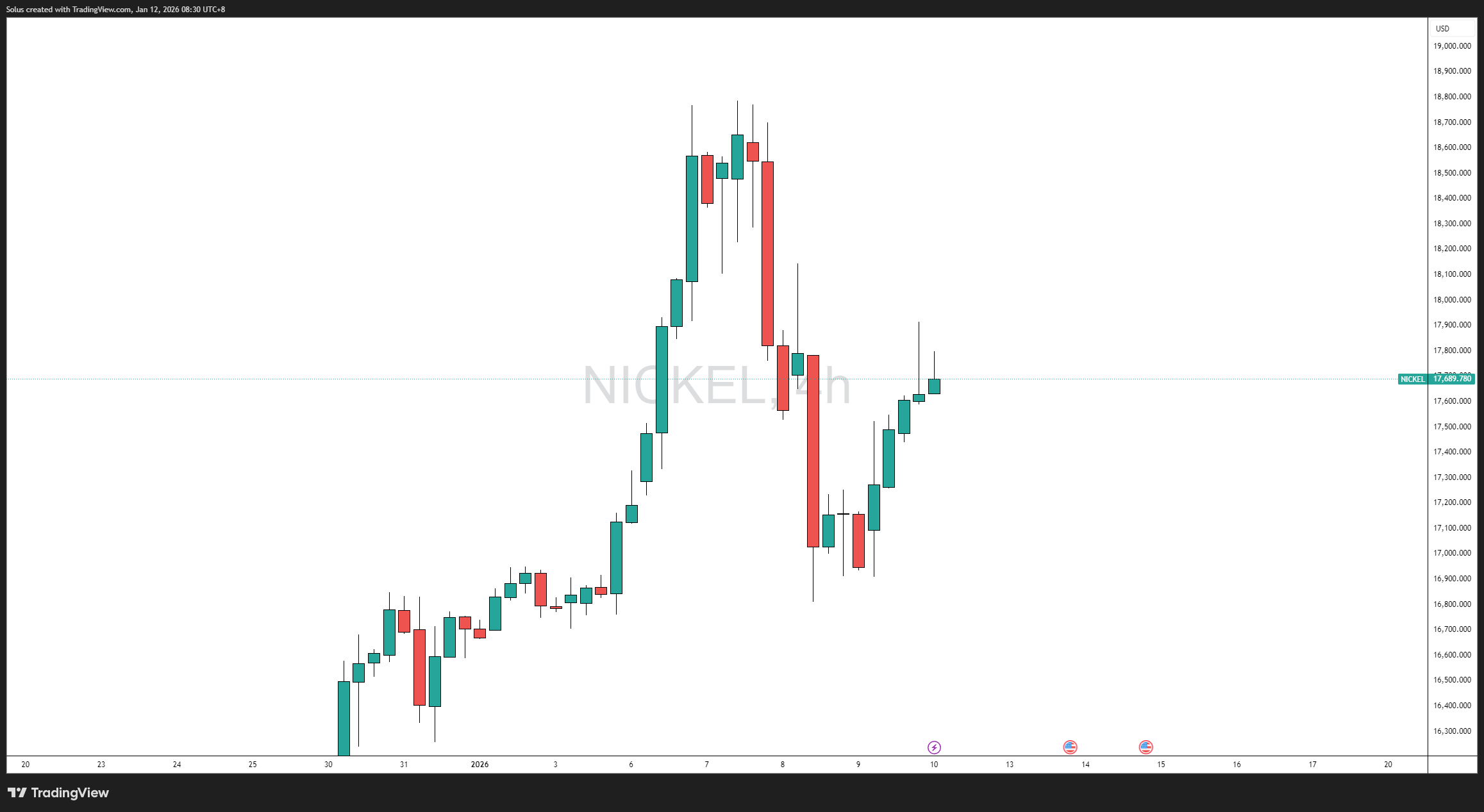 From a technical perspective, nickel’s price action reflects a strong impulsive rally followed by a controlled correction—a classic continuation setup rather than a trend reversal.