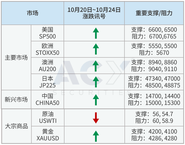 中国方面,本周召开四中全会,预计将公布十五五规划蓝图,根据历史经验,五年计划发布后,股市投资氛围往往偏向正面。需留意的是,中美间的稀土管制纷争再起,推测中国此举是为在月底 APEC 会议领袖会面中美第五轮贸易谈判前,增加谈判筹码。整体来看,事态不太可能演变为长期极端的关税壁垒,因此全球主要股指在中美关系影响下,仍维持逢低看涨格局。