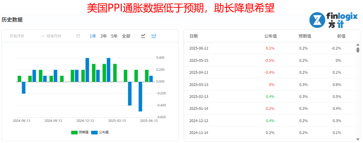 尽管中美双方于伦敦会谈的最终贸易框架尚未出炉,但昨日公布的美国PPI通胀数据增幅再度低于市场预期,呼应本周三的CPI通胀数字。与此同时,220亿美元规模的30年期美国国债拍卖需求表现稳健,一方面反映了市场对于美国降息预期的提升,另一方面可看到市场买家对于较高收益率的长债仍感兴趣,也暂时化解了此前市场对于美国大而美财政法案进一步造成未来美国债务上升的忧虑,美元因而再度走跌,并且跌破98大关,来到3年多来低位,受此影响,非美货币与黄金同步上涨,其中欧元来到逾3年半高位,黄金收盘价来到1个多月来高位,而美国三大股指则在数据面交错影响以及甲骨文公司强劲业绩展望下,盖过了中东局势及波音股价重挫的影响而持续上涨。