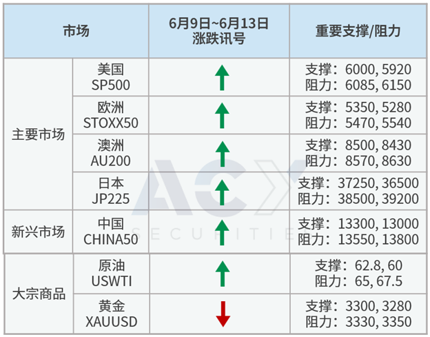 上周公布一系列美国经济数据并不乐观,ADP就业新增人数创两年新低、ISM服务业PMI跌到50荣枯线以下,不过上周仍在美中领导人通话,以及非农人数超预期激励下,标普500指数终于突破6000大关阻力。本周中美贸易代表还将在伦敦会面,乐观预期可能进一步推动股指挑战前高6150,但须留意目前美股市盈率已来到22倍相对高点,且本周还有美国通胀数据要公布,但在美股突破阶段阻力下仍维持偏多看法。