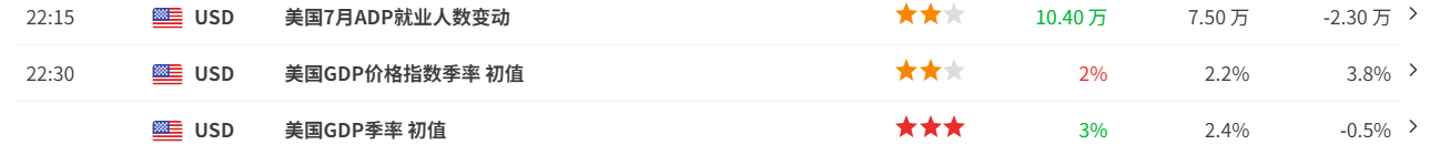 昨晚还公布了两项关键经济数据:ADP小非农新增就业大幅优于预期,相较6月减少2.3万人明显改善;美国第二季GDP年增率达3%,同样远超市场预估,主因是企业提前拉货效应减缓、进口大幅下降,对GDP形成推升。这两项强劲数据也为鲍威尔延后降息提供了更充足的底气。