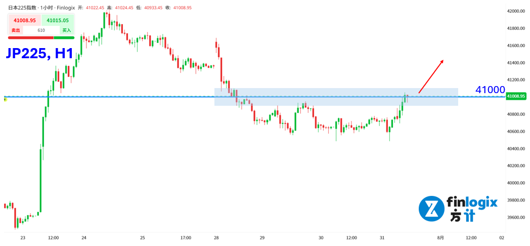 技术面:日经225指数自上週五起开始回落,虽然本週一跌势趋缓,近三个交易日仍维持在40500~41000区间震盪。目前价格在41000关口尝试突破,搭配今天日本央行利率决议,有望成为推动指数脱离震盪区间的催化剂。短线而言,若小时线维持在41000之上,可考虑顺势布局多单。