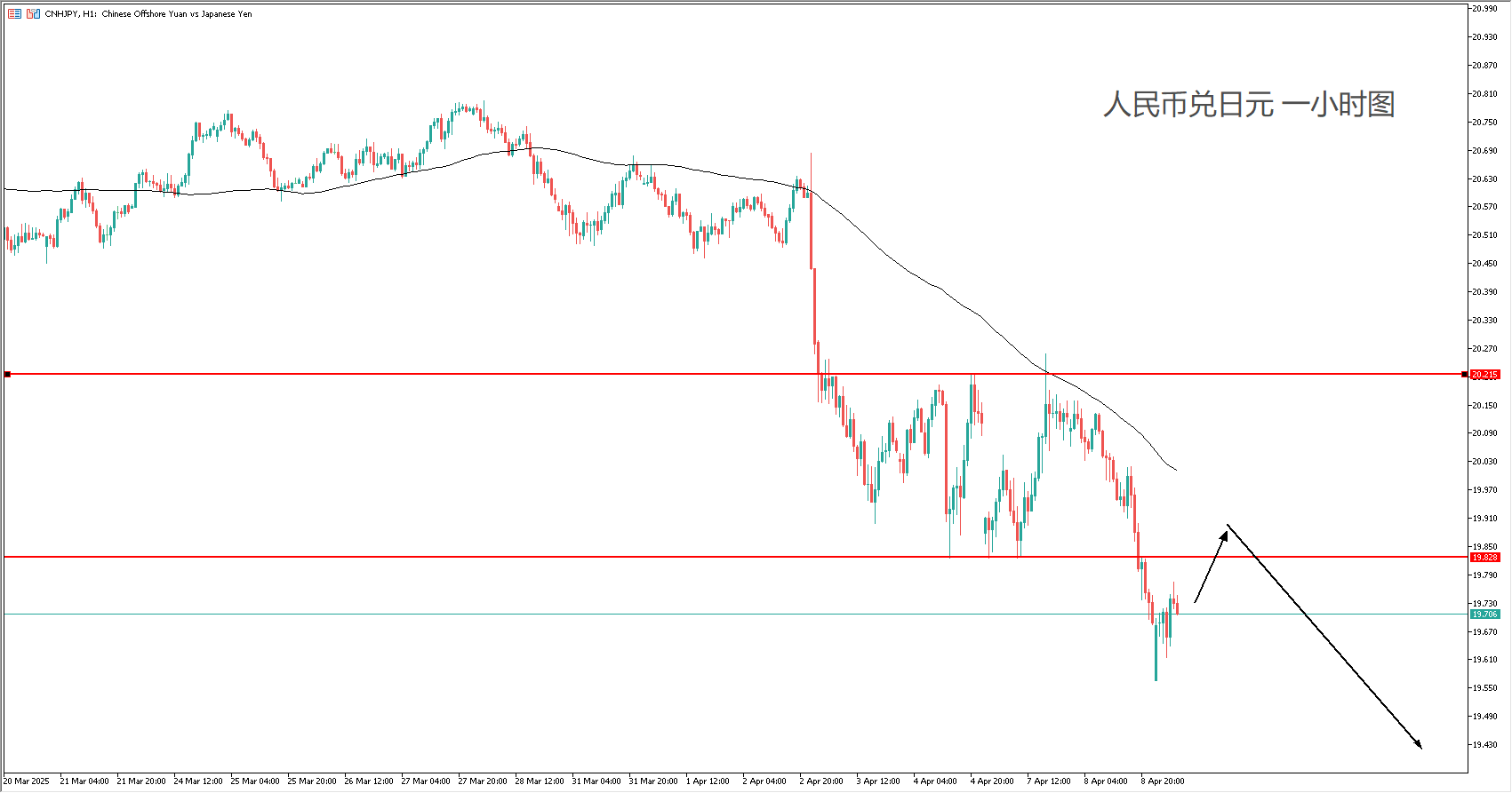 技术面:100均线稳定向下,汇率连番向下突破,空头动能明显。不过RMB本身波动不大,更适合进行回踩看空的策略,持单时间需要相应拉长。