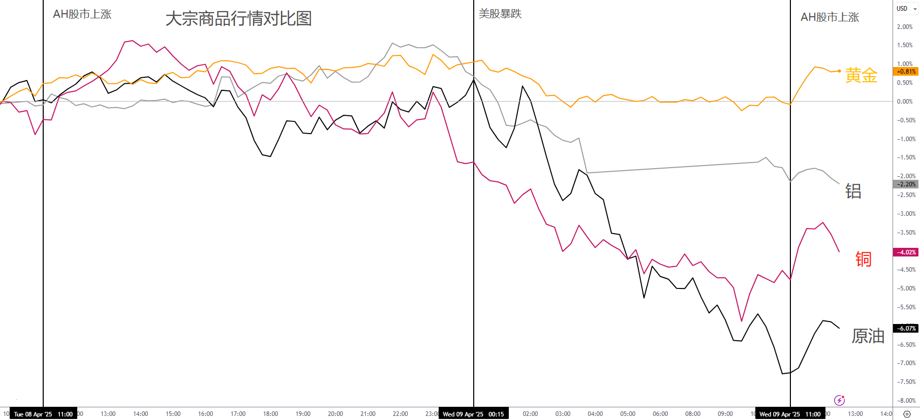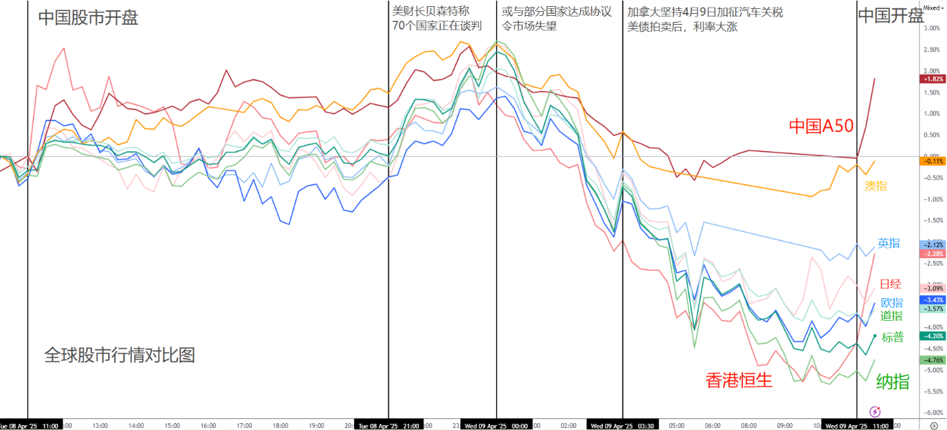 其他股市:多数股市随美股波动,表现极差。这里不得不说,作为长期分散美股风险的最佳选择,中国A50指数表现较为抗压。尤其在中国强硬反击的态度下,市场期待中国的经济刺激与东升西落的经济走向,因此AH股市开盘大幅上涨。澳洲指数受到澳元暴跌影响,同样较为抗压,但考虑到汇率损害,其实表现并不是很好。