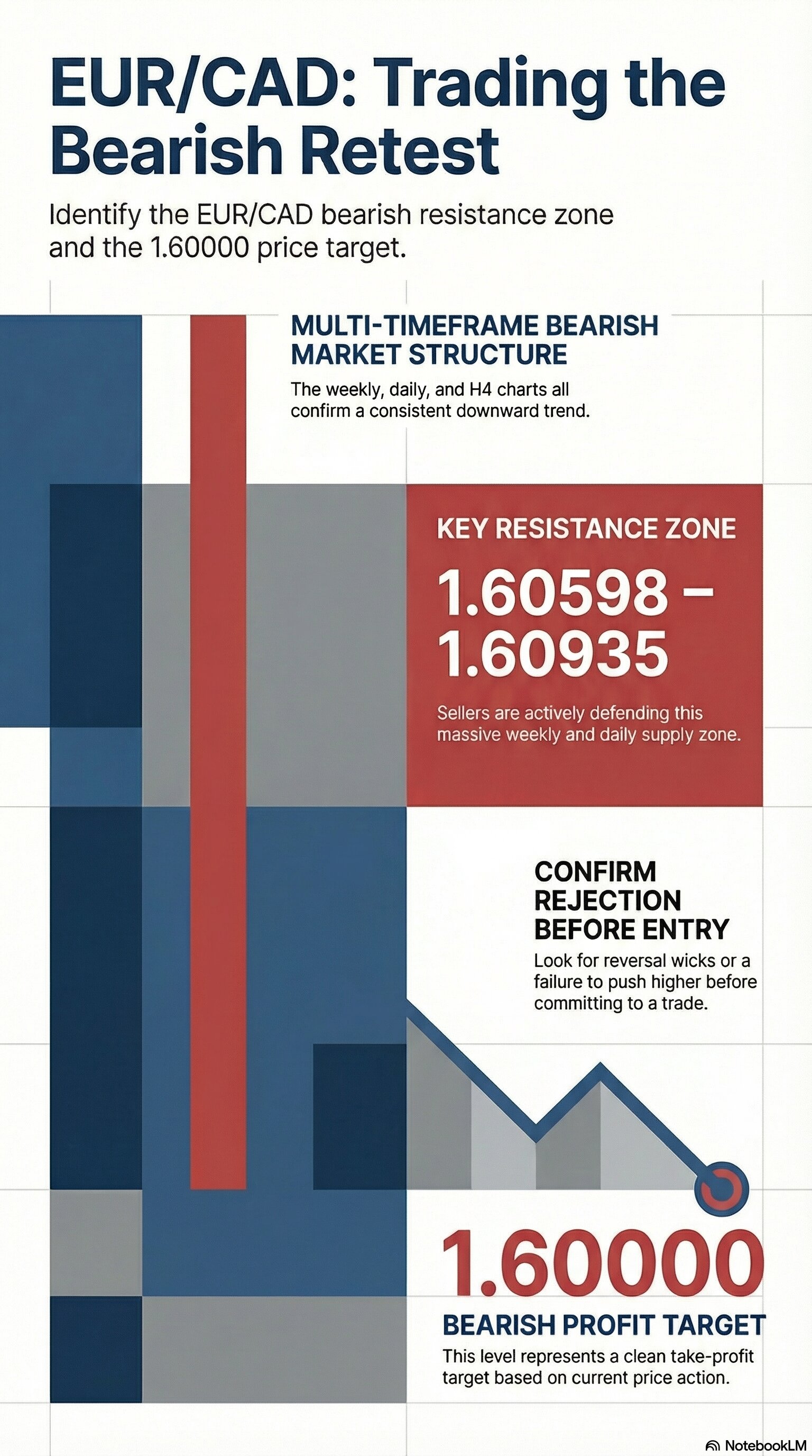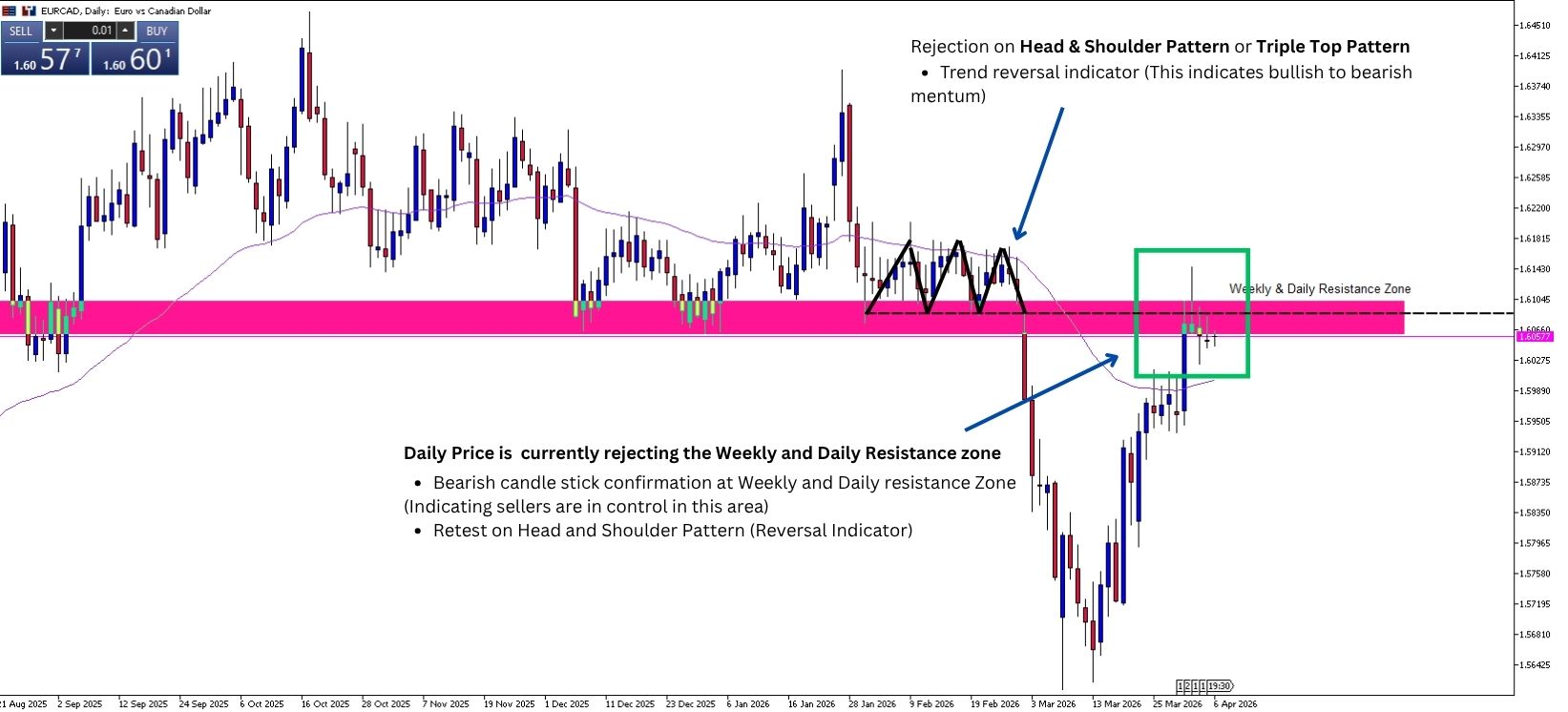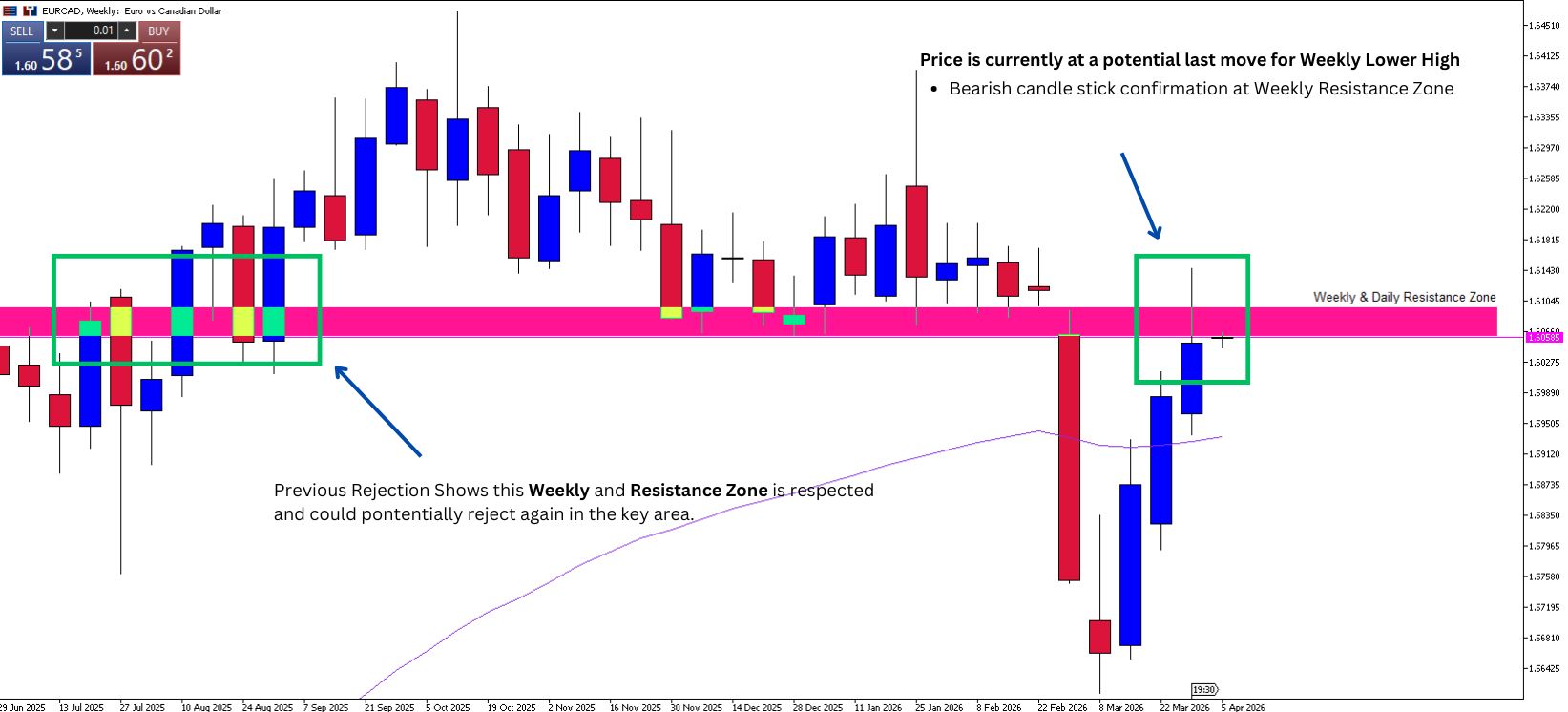 • On the weekly chart, EUR/CAD is making a final pullback, forming a potential lower high in the resistance zone.