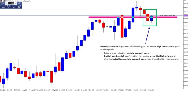 • On the weekly timeframe, CAD/JPY appears to be forming a potential final higher high while reacting from a key daily support zone.