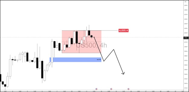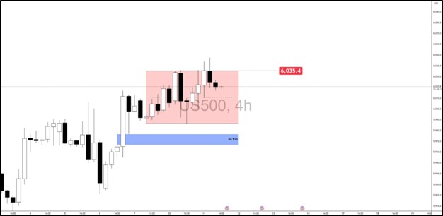 The S&P 500 mirrors Nasdaq’s posture, consolidating tightly just under 6,035, with rejection wicks and no strong displacement yet.